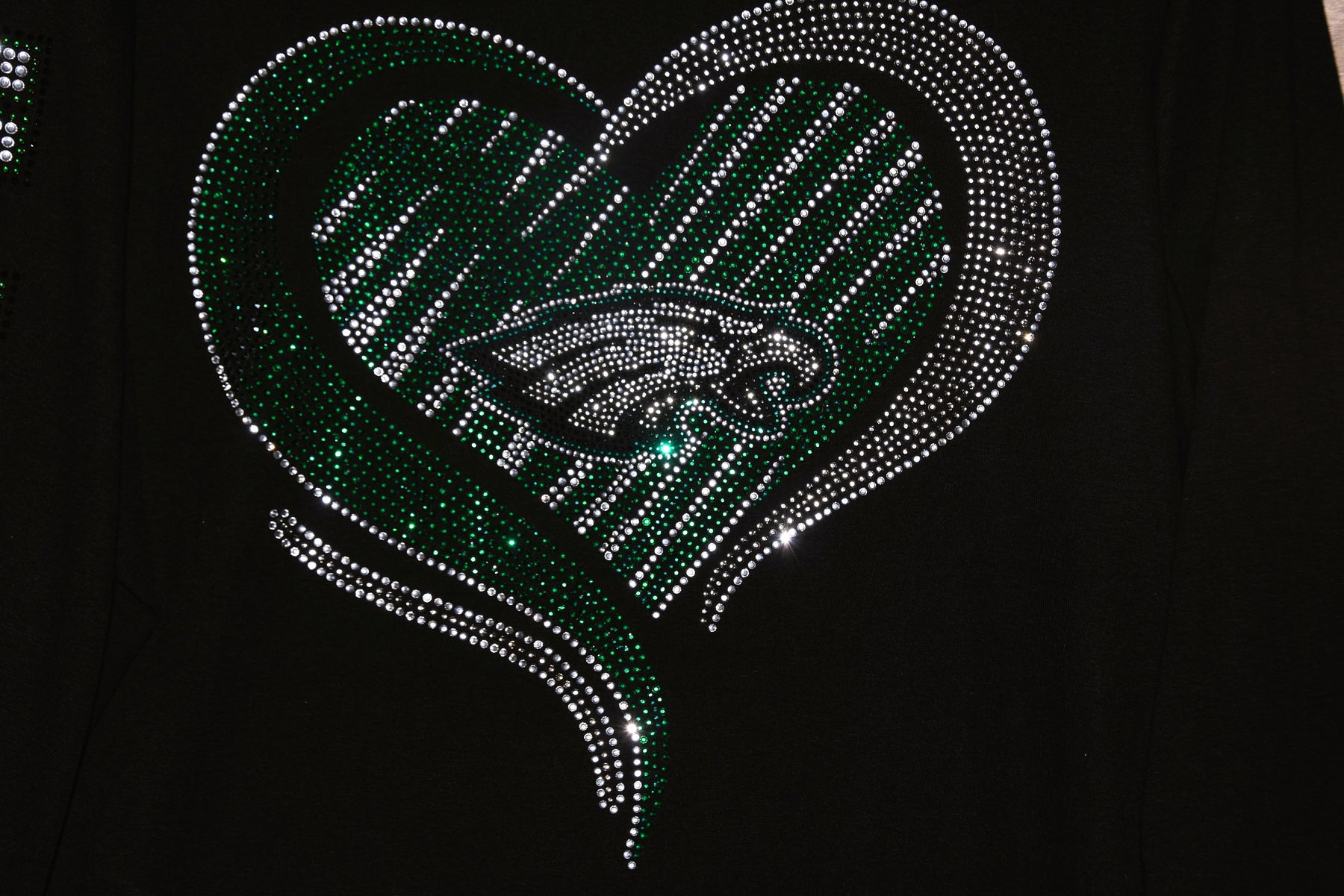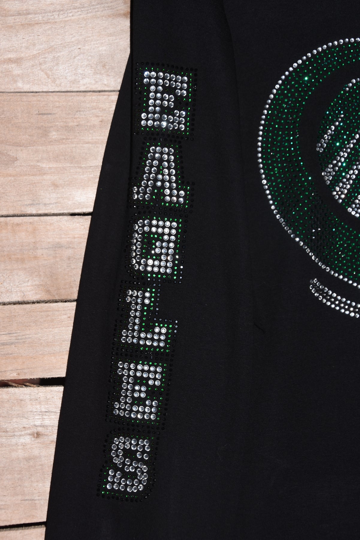 Cheer on your favorite Eagles team wearing this first quality rhinestone bling shirt created with lots of sparkling vivid emerald green, jet black and diamond clear rhinestones.   There are 2 designs on this shirt, a large bold circular Eagles design on the front and the vertical word Eagles on the sleeve.  What a great shirt for Game Day!  This will be your good luck, go to, game day shirt from now on!