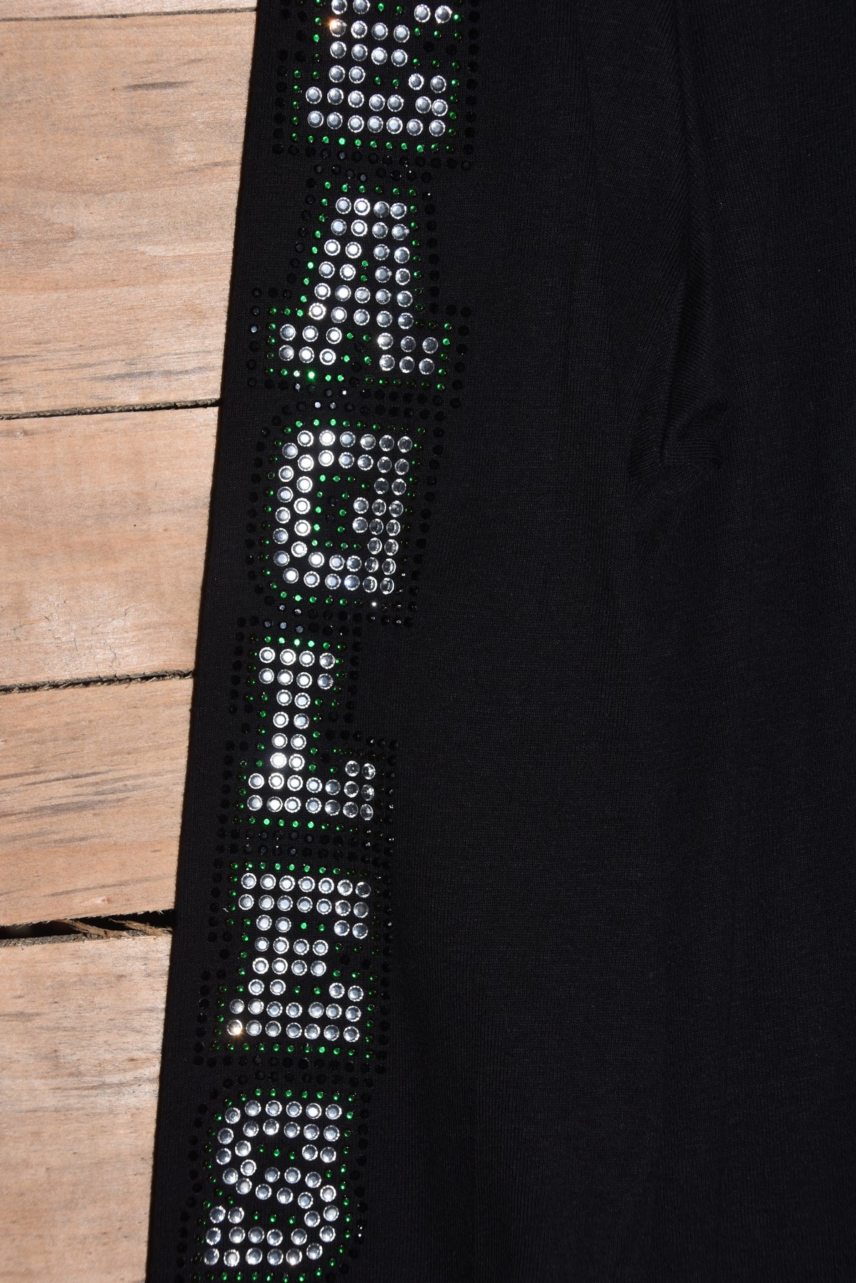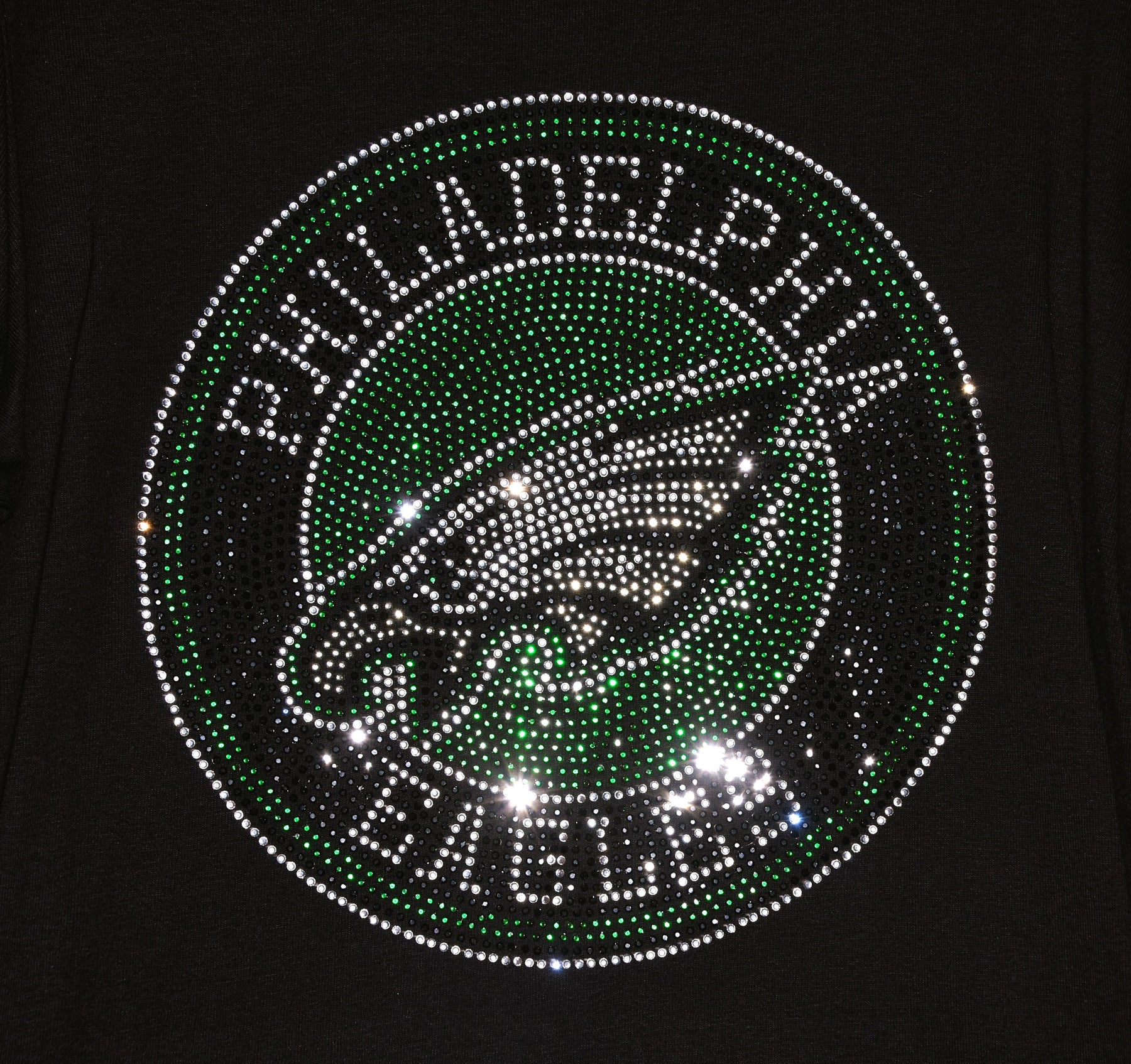 Cheer on your favorite Eagles team wearing this first quality rhinestone bling shirt created with lots of sparkling vivid emerald green, jet black and diamond clear rhinestones. There are 2 designs on this shirt, a large bold circular Eagles design on the front and the vertical word Eagles on the sleeve. What a great shirt for Game Day! This will be your good luck, go to, game day shirt from now on!