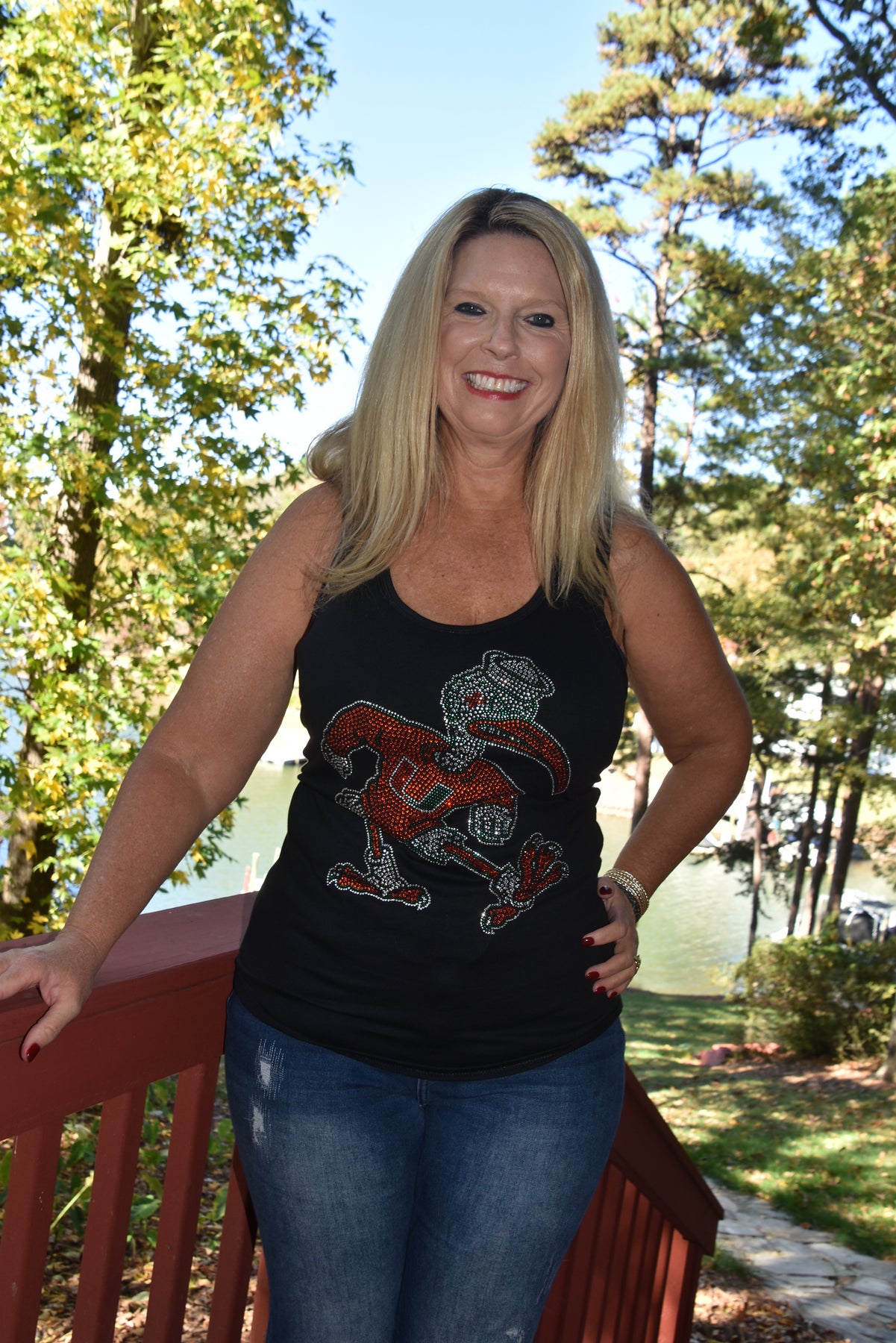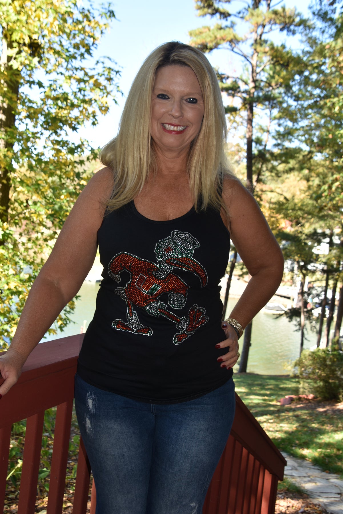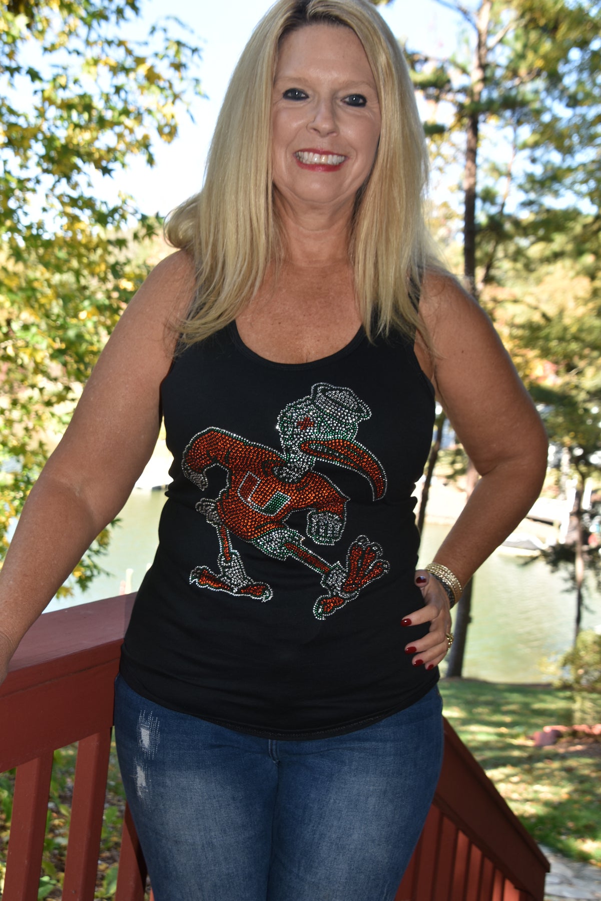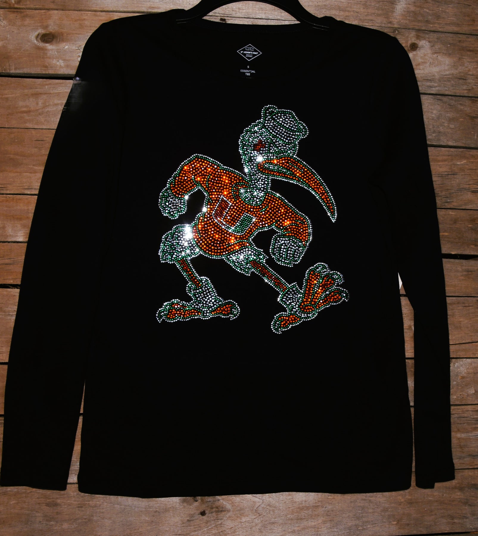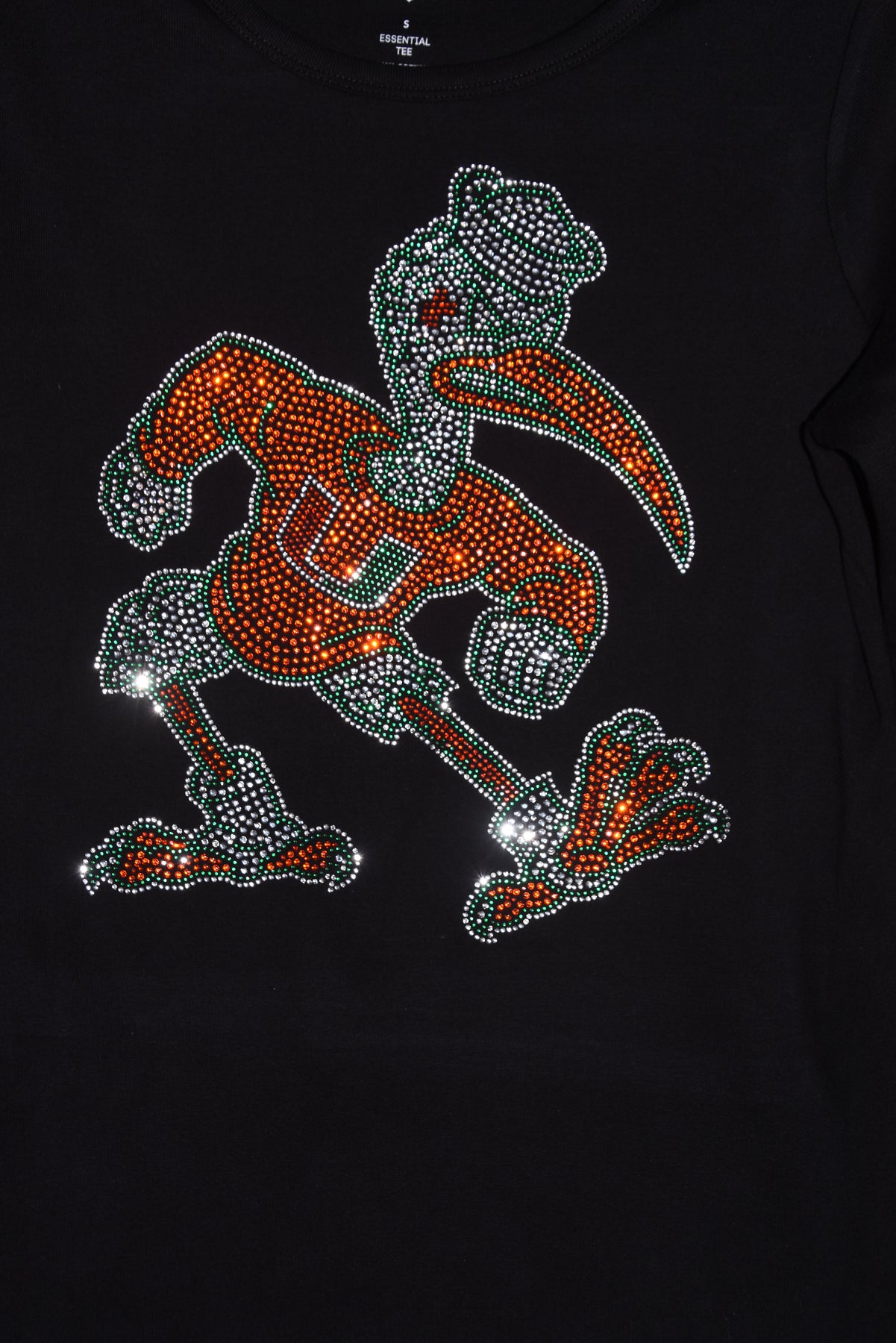 Show off your fun style in this first quality custom made to order rhinestone bling shirt. This is a gorgeous design featuring lots of sparkling rhinestones. This is my newest Hurricanes design and it's loaded with orange, green and diamond clear rhinestones with lots of sparkle!