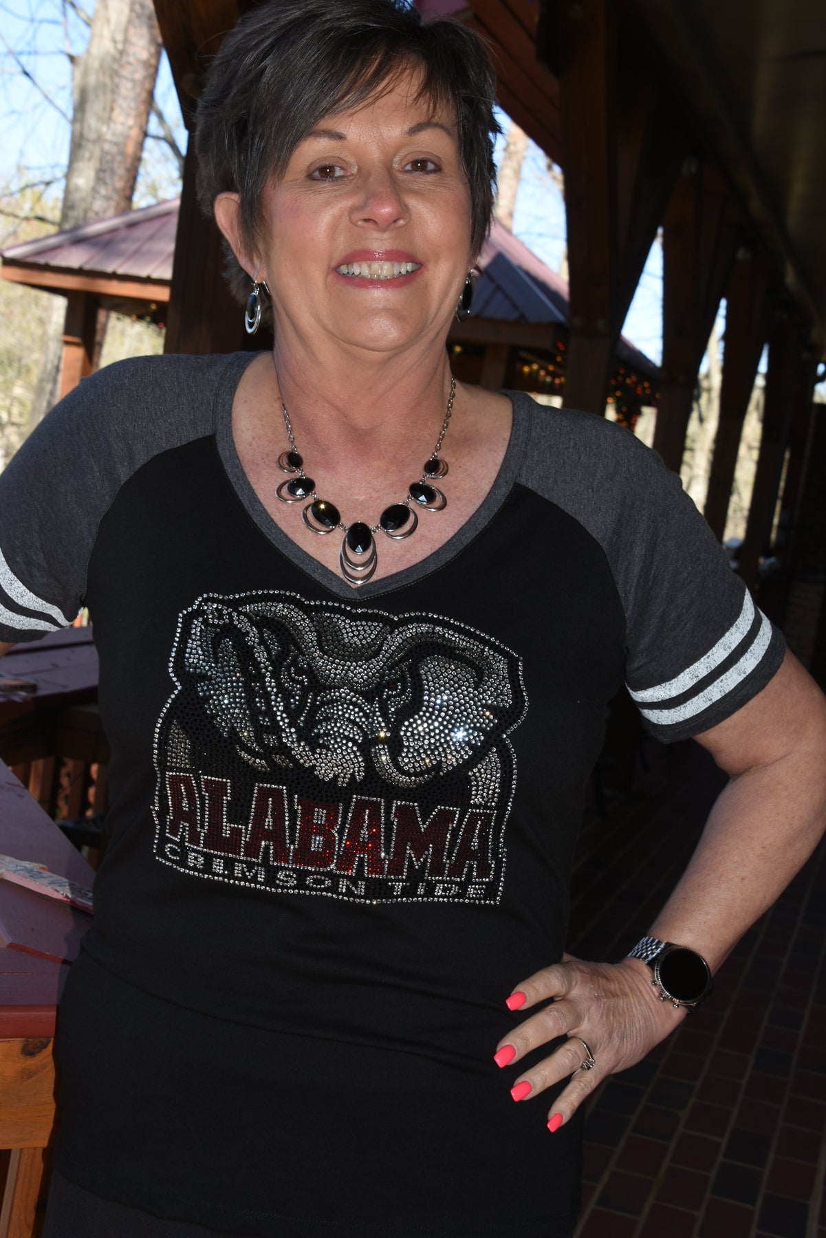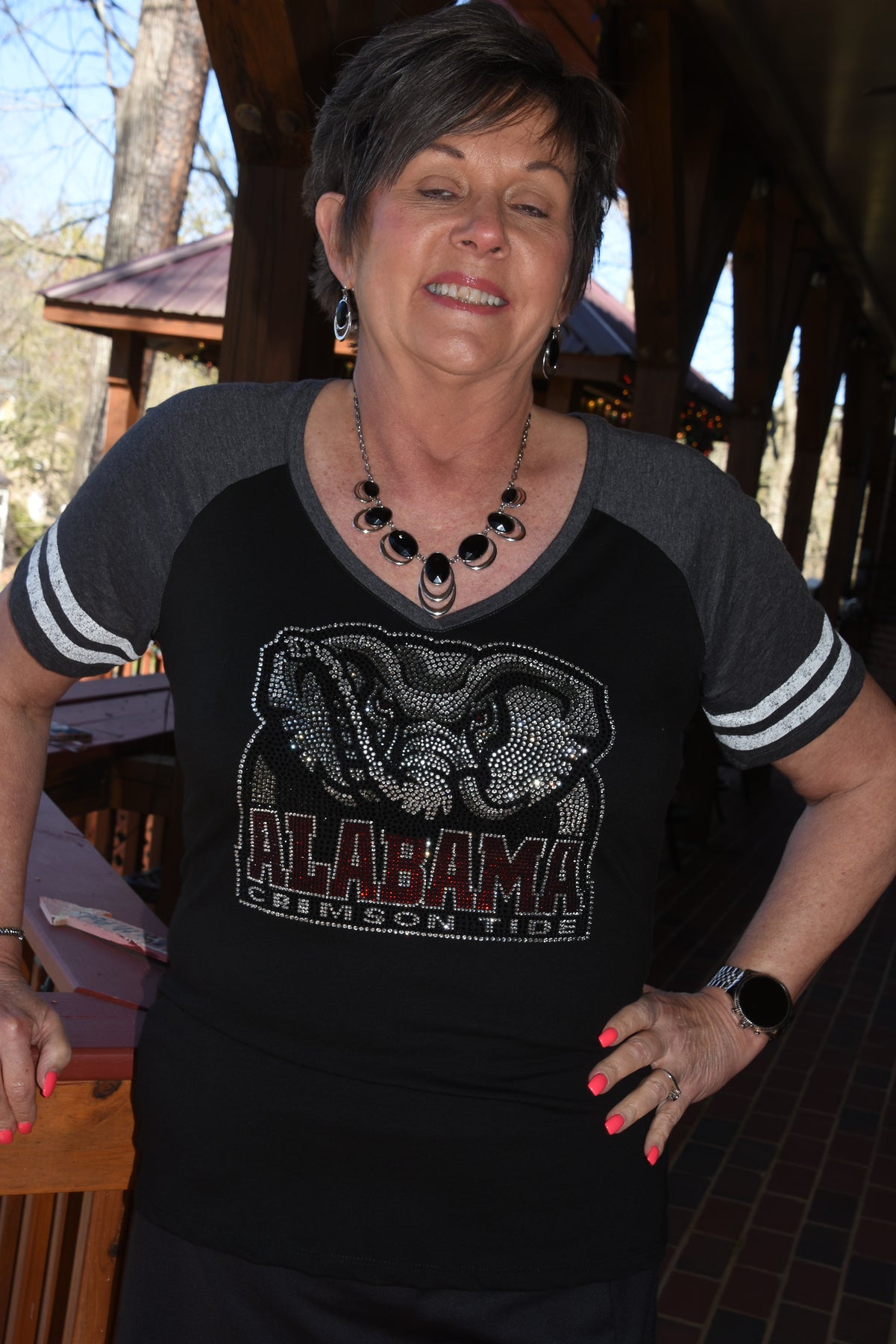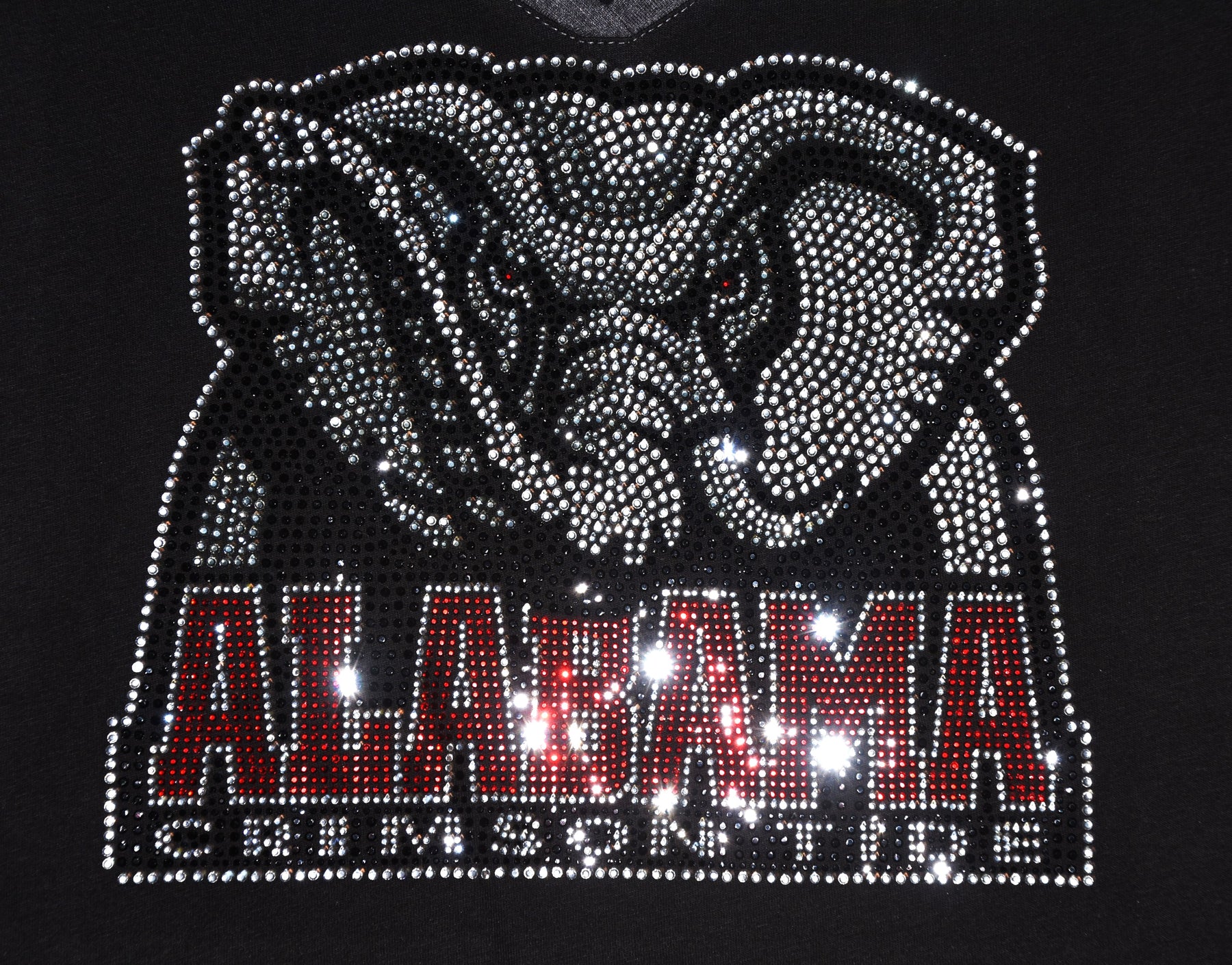 Show your love of Alabama in your first quality rhinestone bling, custom made to order rhinestone bling shirt. This is a large and ornate rhinestone design with lots of crimson red, black and diamond clear rhinestones.