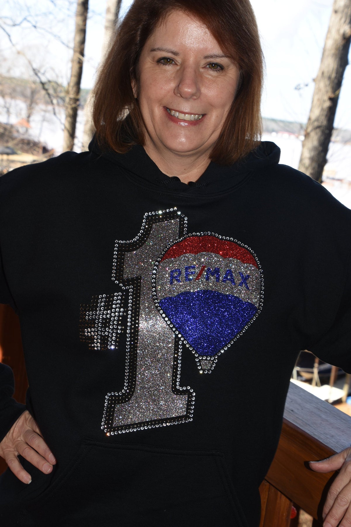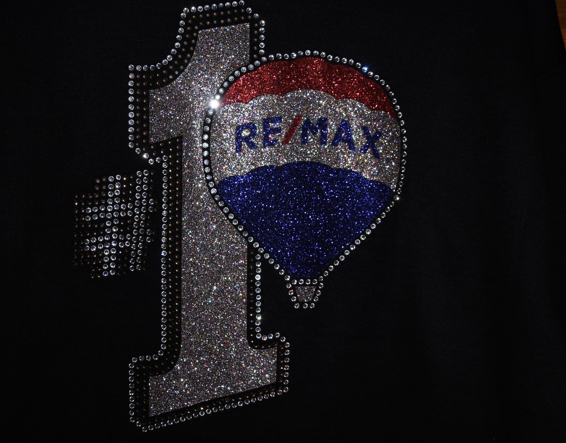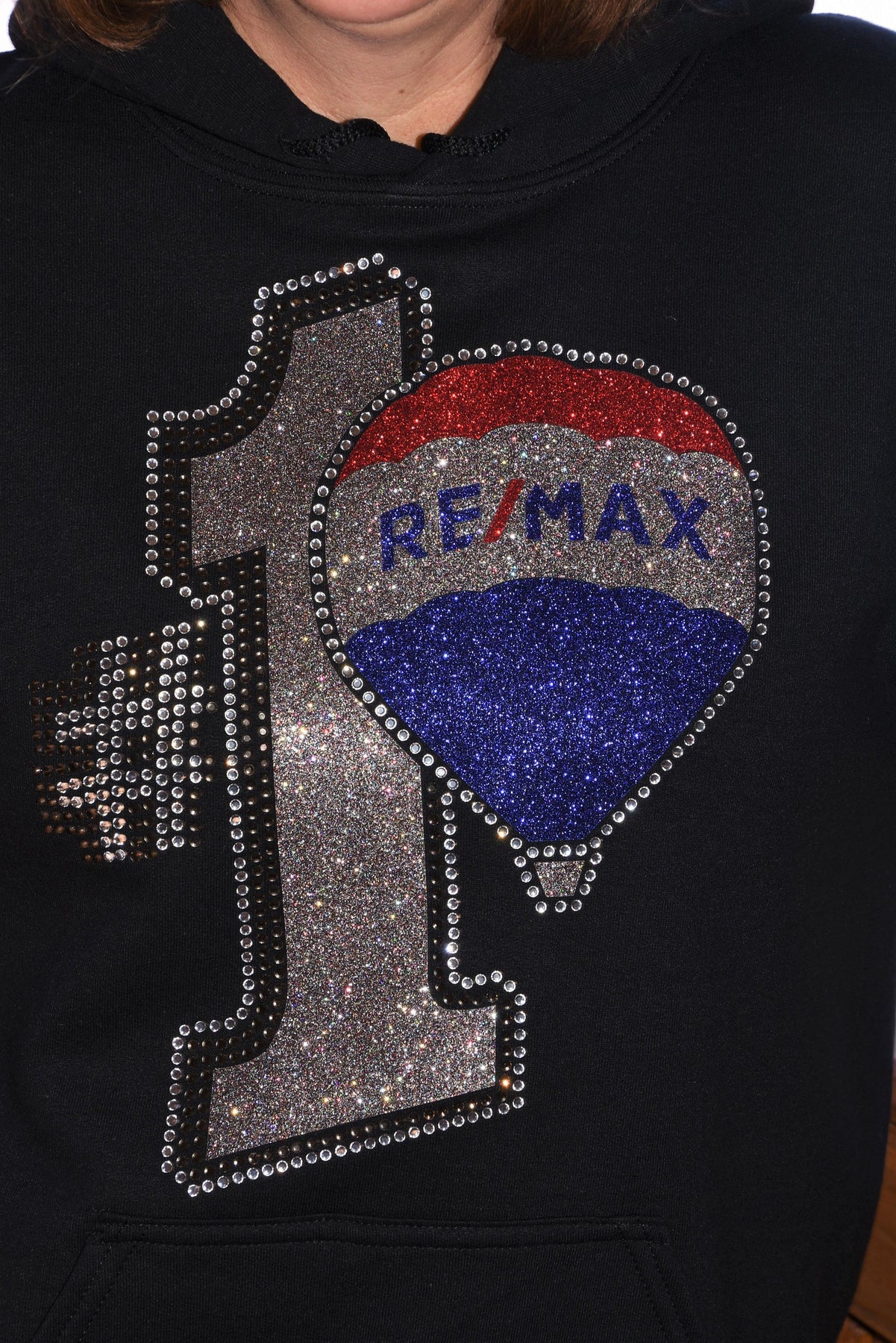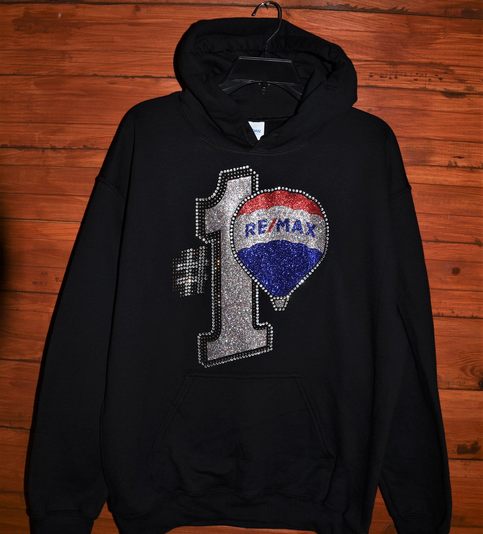 Show off your fun RE/MAX style in this first quality rhinestone bling, custom made to order oversized hoodie. This is a large and ornate rhinestone design with lots of red, royal blue, AB Silver and clear rhinestones & glitter with lots of sparkle.