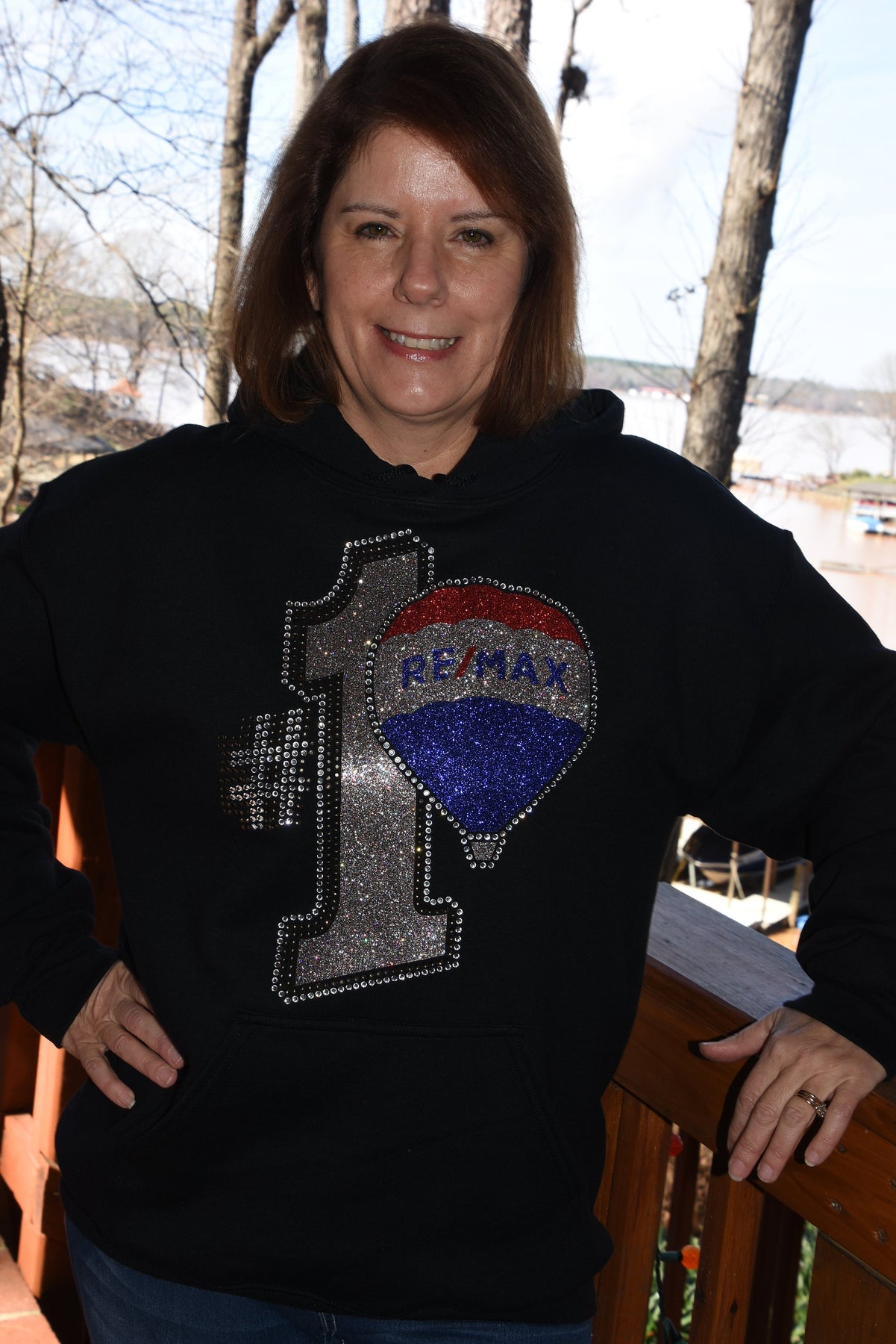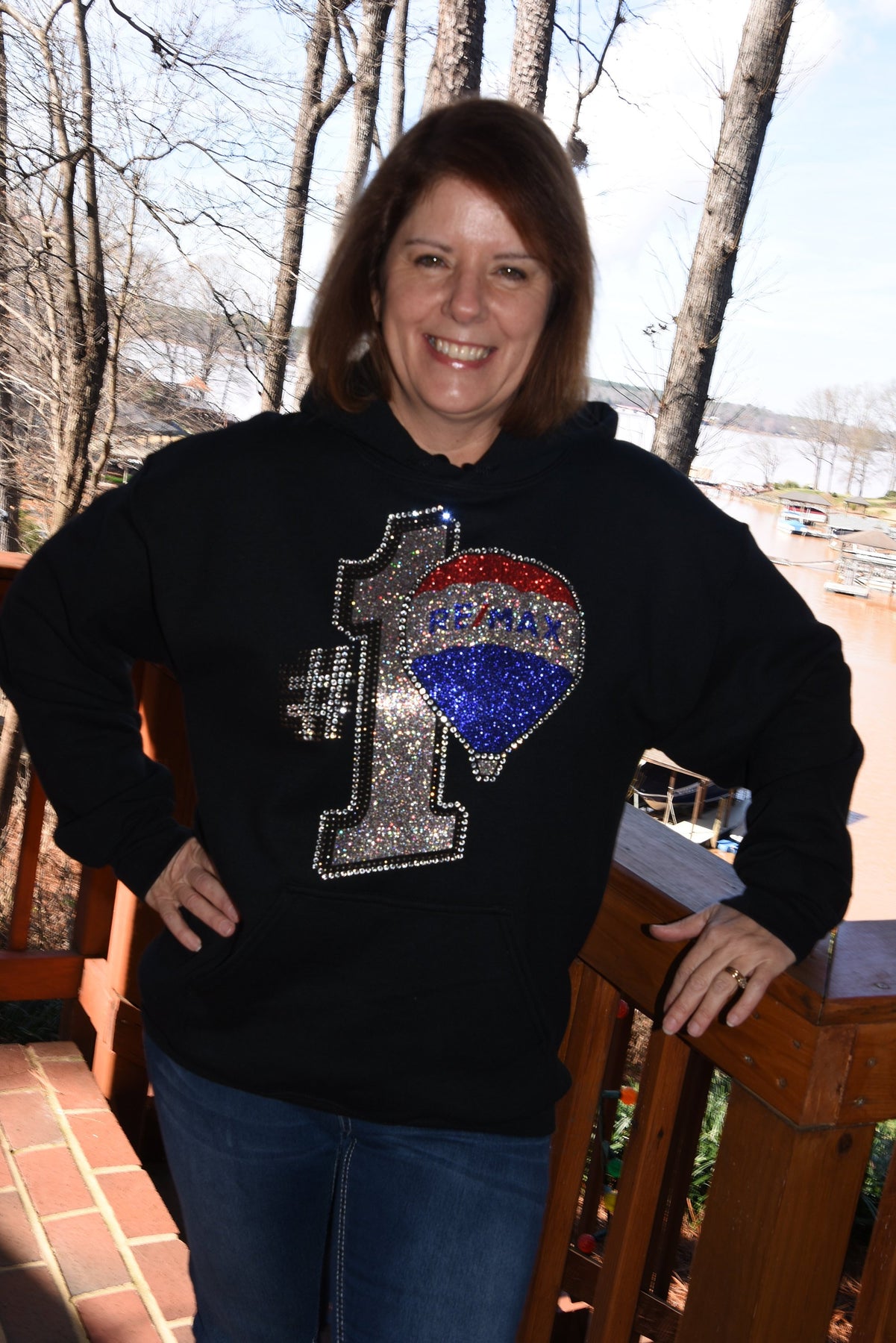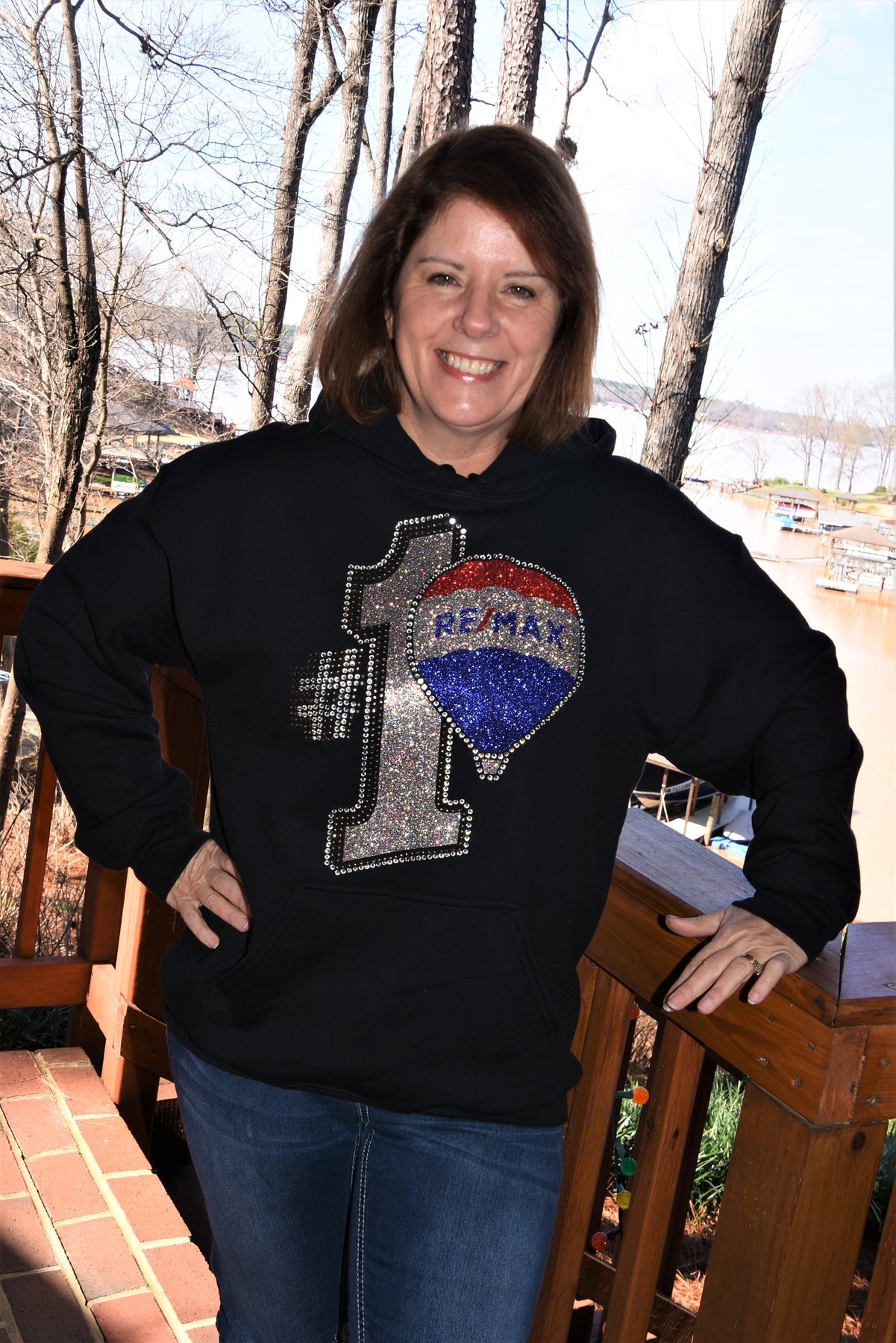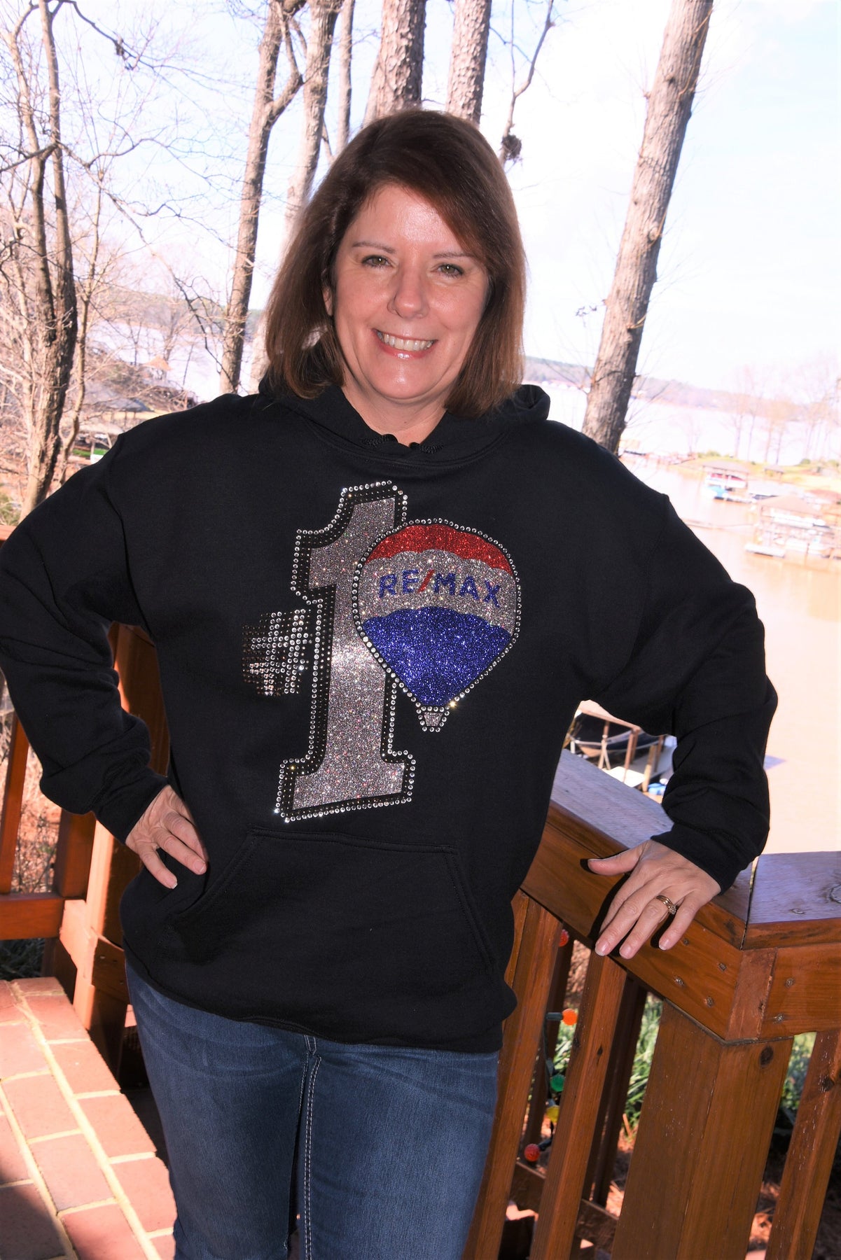 Show off your fun RE/MAX style in this first quality rhinestone bling, custom made to order oversized hoodie. This is a large and ornate rhinestone design with lots of red, royal blue, AB Silver and clear rhinestones & glitter with lots of sparkle.