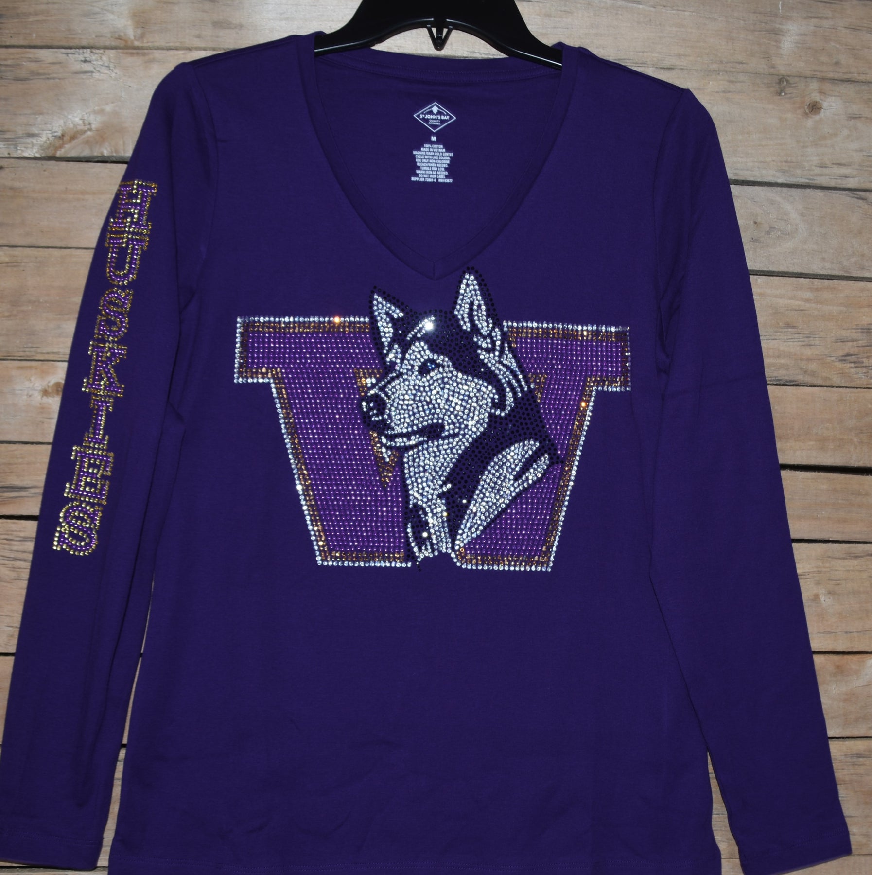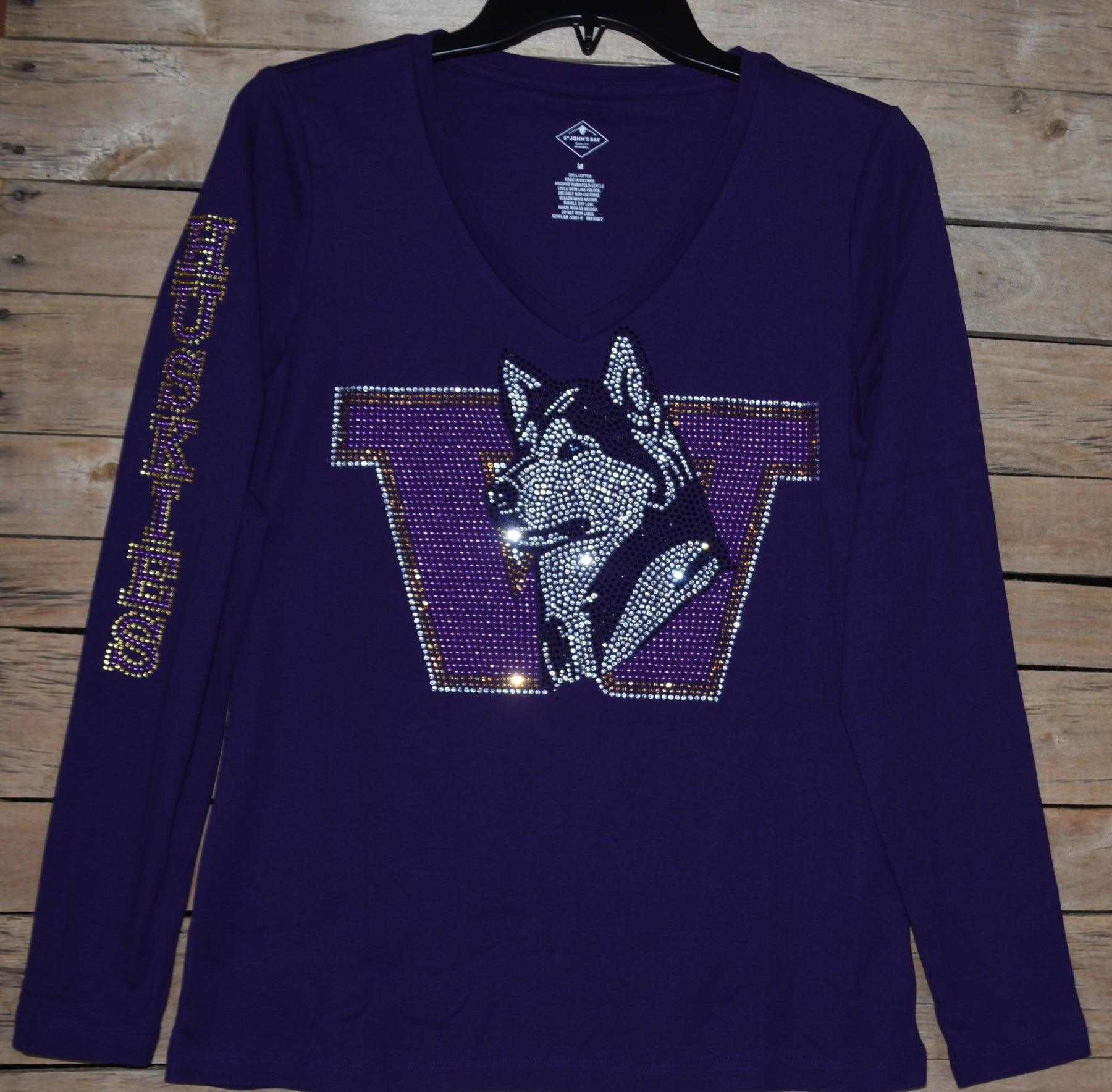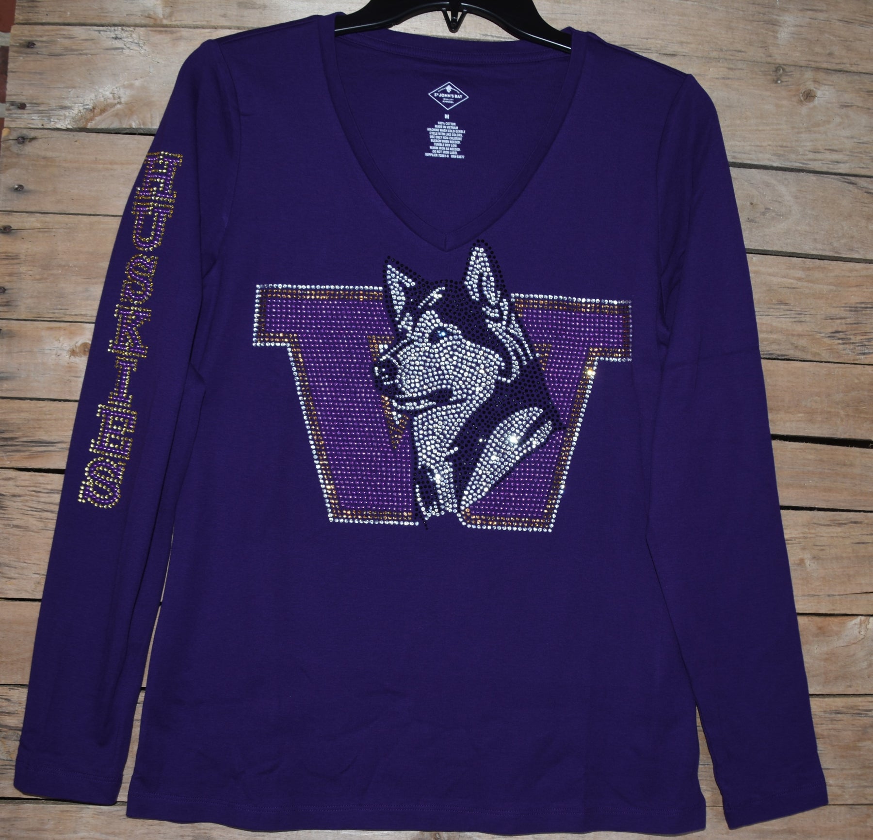 This is a long sleeved shirt featuring a large rhinestone and rhinestud Huskies W design on front and a rhinestone and rhinestud Huskies on a sleeve.