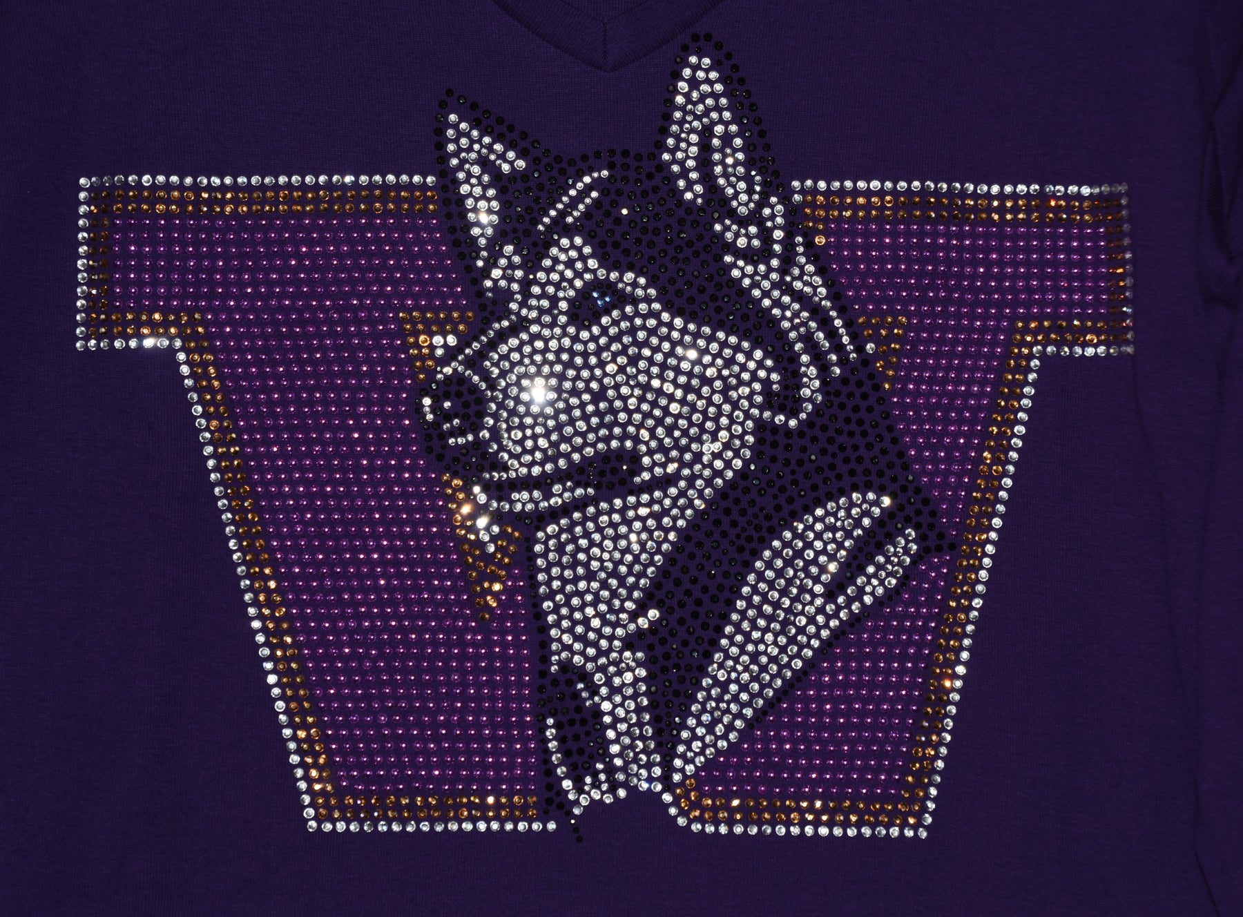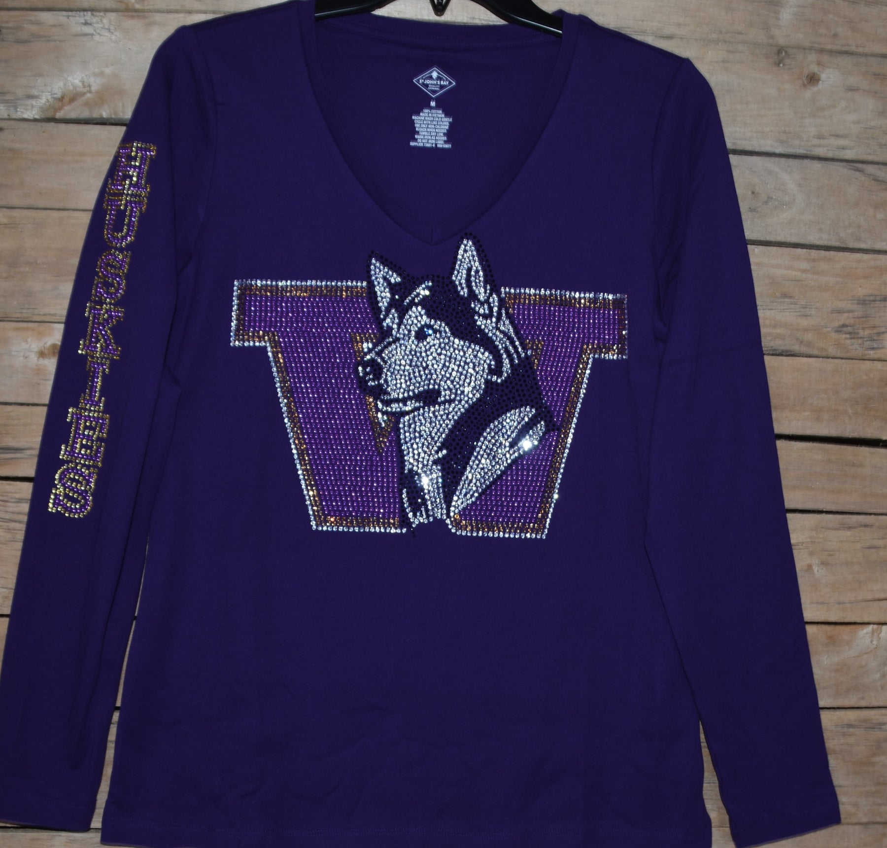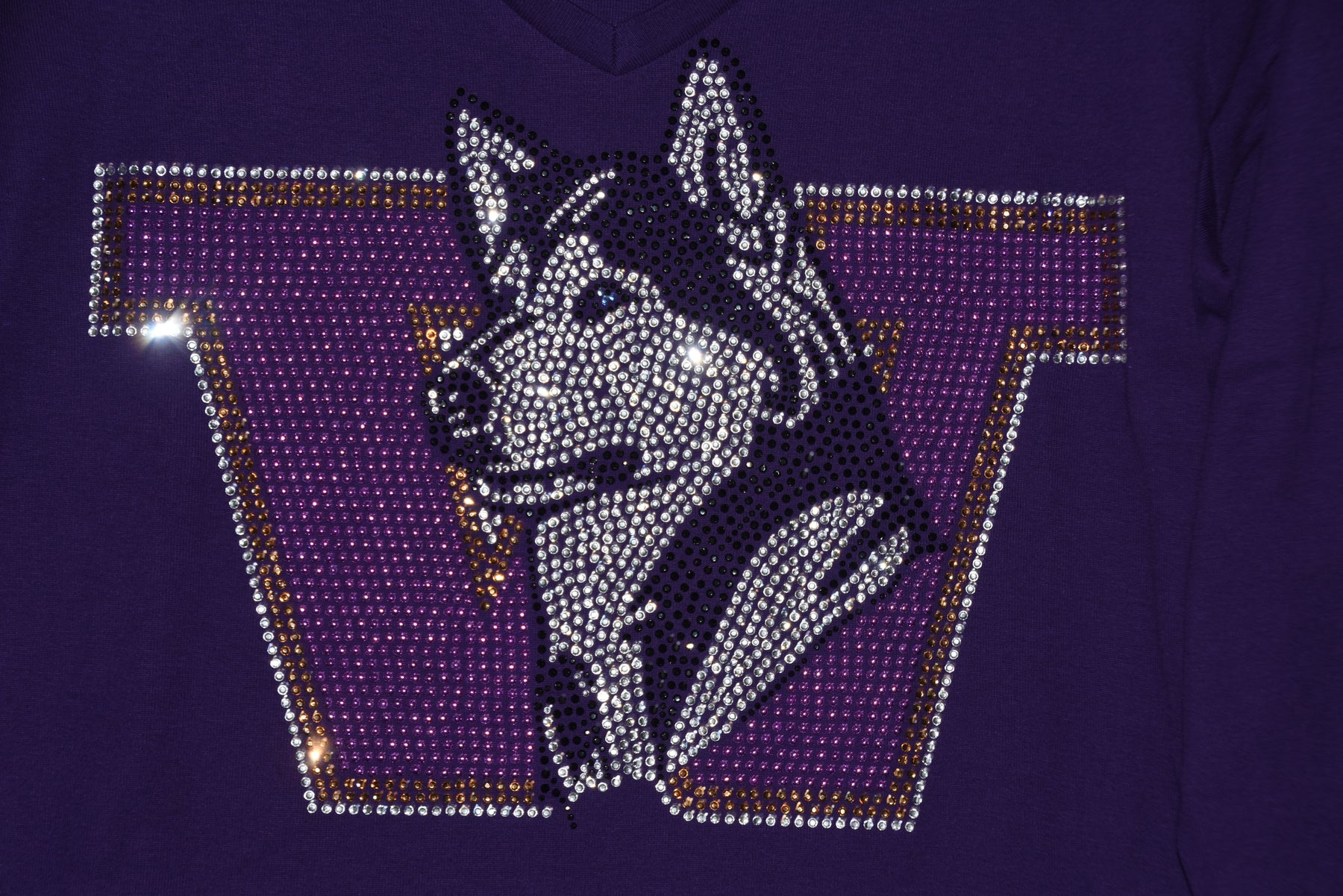 This is a long sleeved shirt featuring a large rhinestone and rhinestud Huskies W design on front and a rhinestone and rhinestud Huskies on a sleeve.