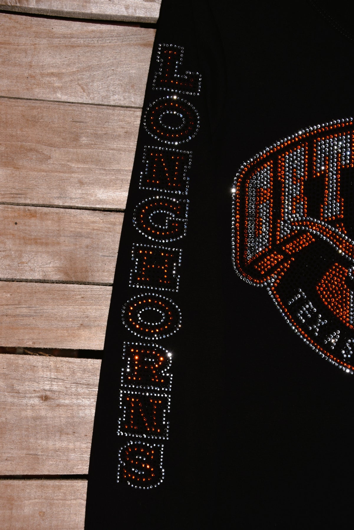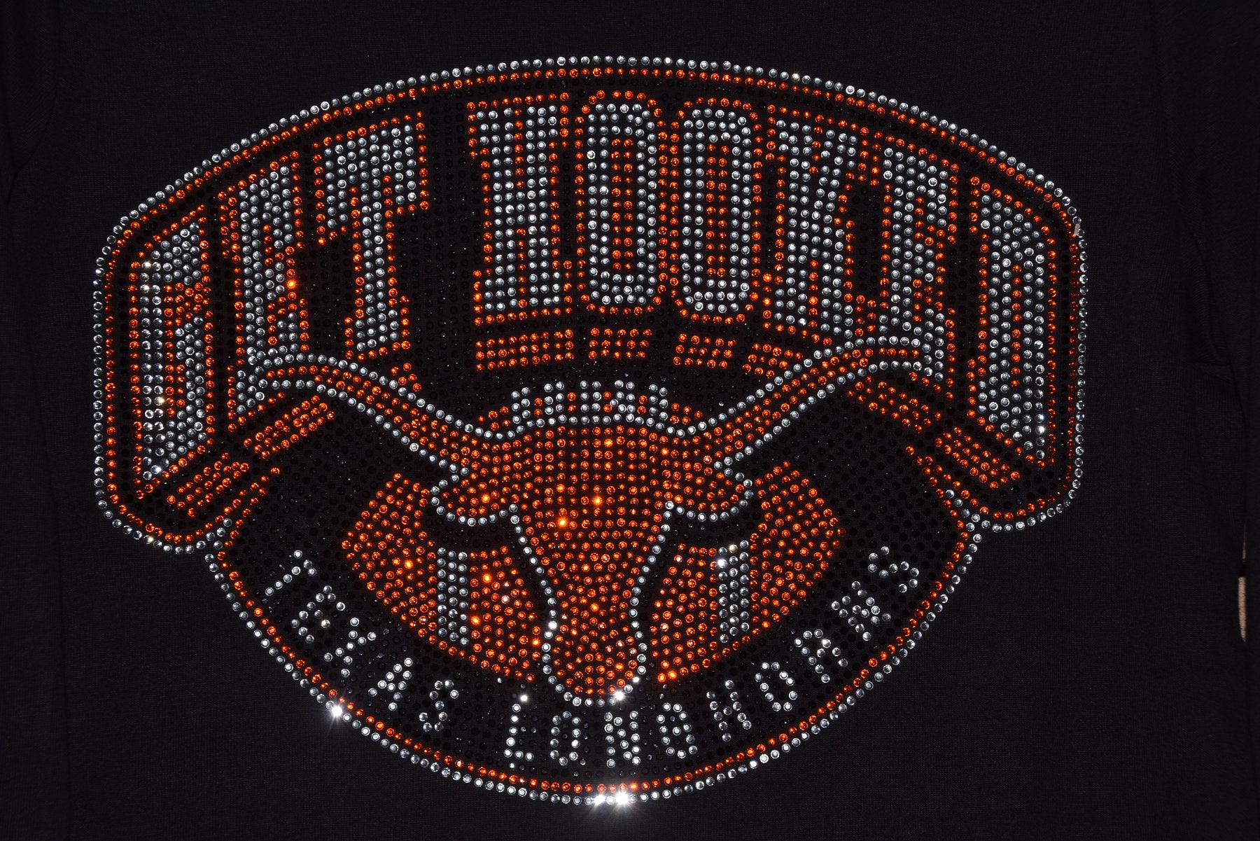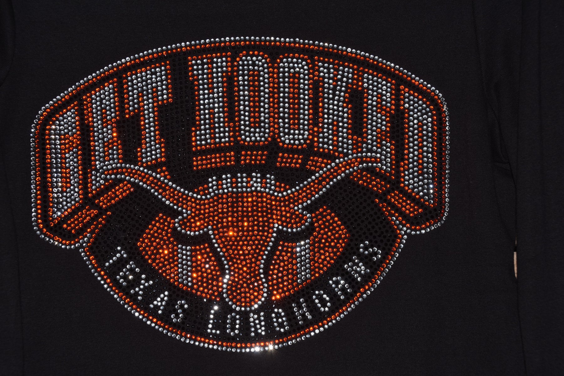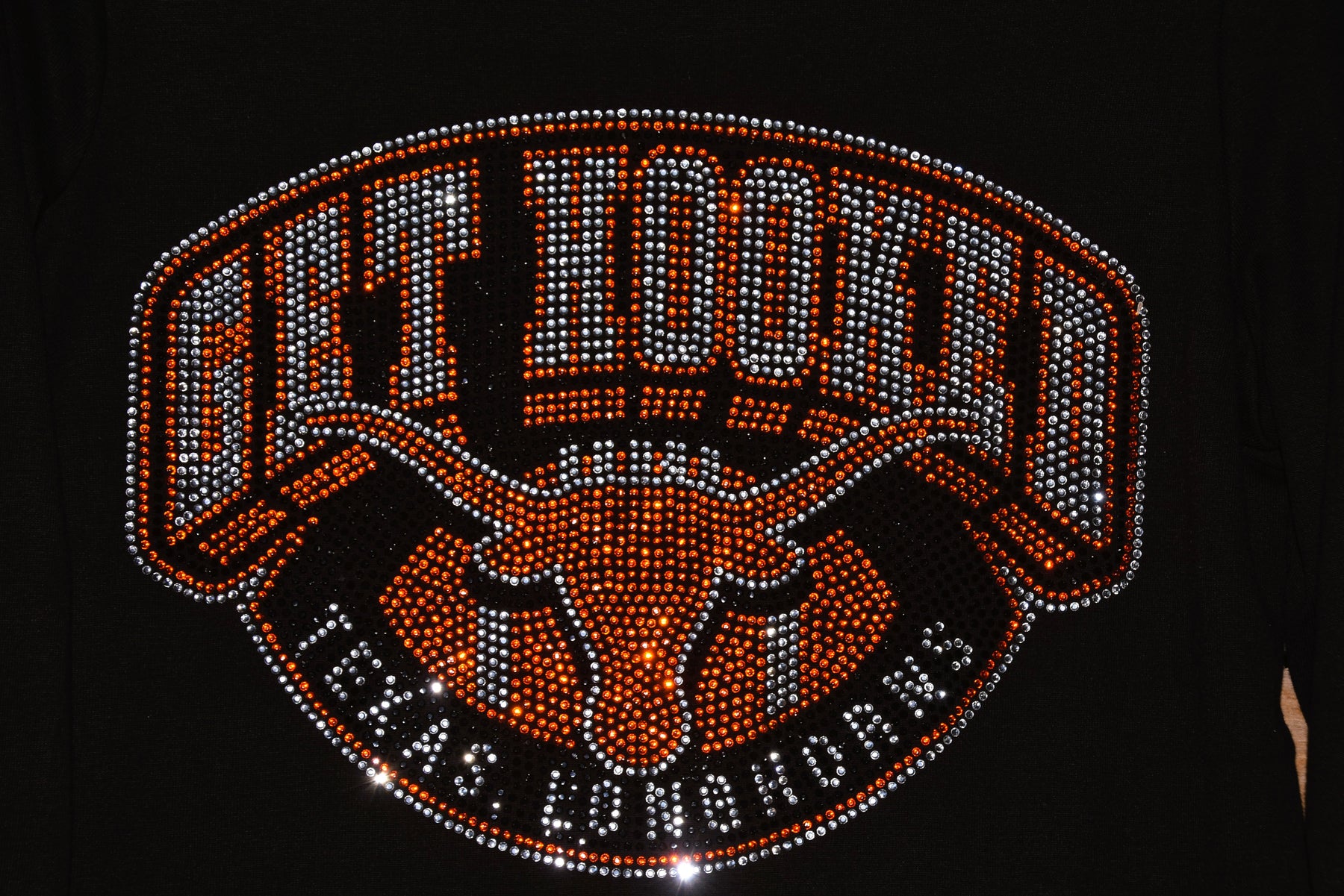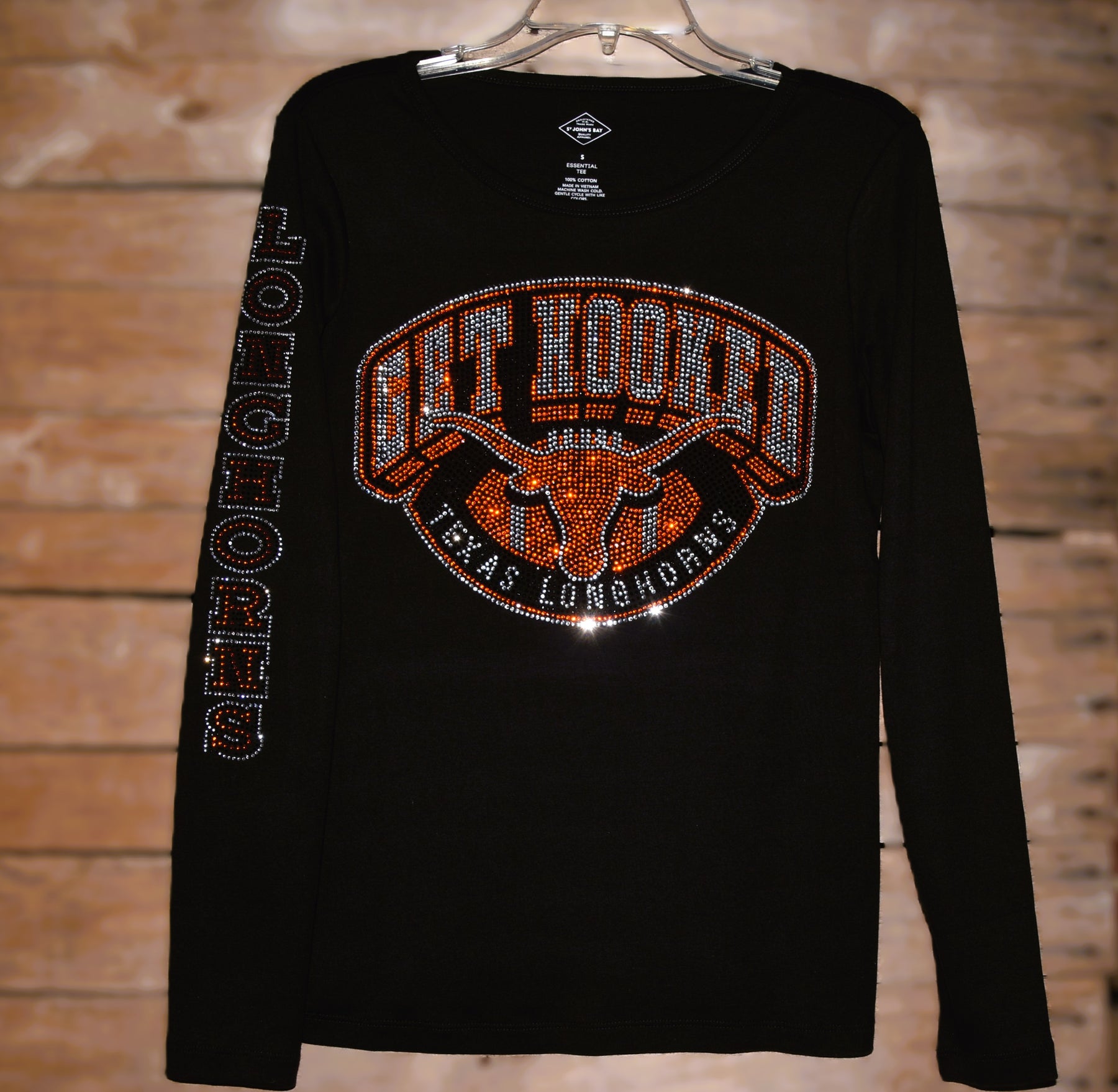 Cheer on your favorite Longhorns team in style with this rhinestone bling custom made to order long sleeved shirt with Longhorns on the sleeve and a large Longhorn design logo on the front of the shirt.