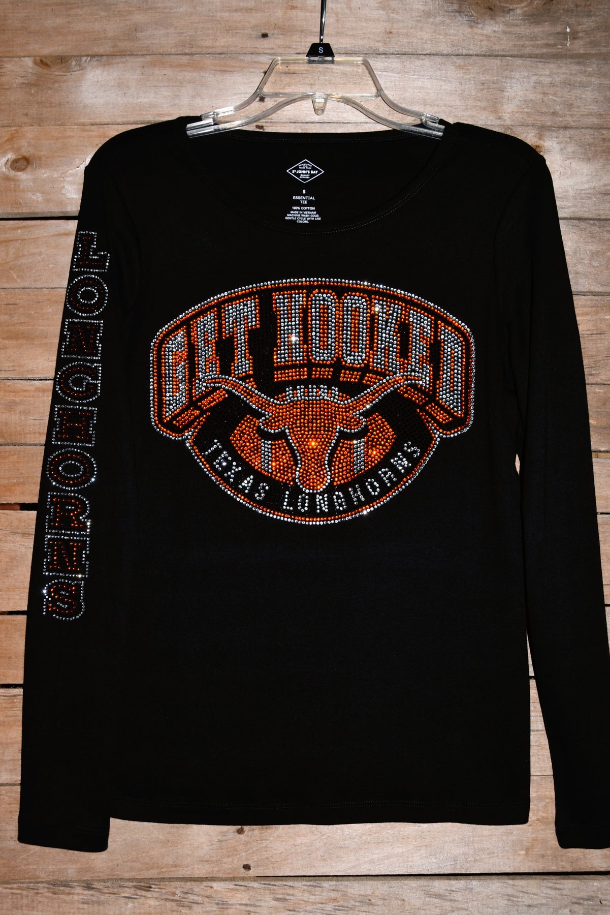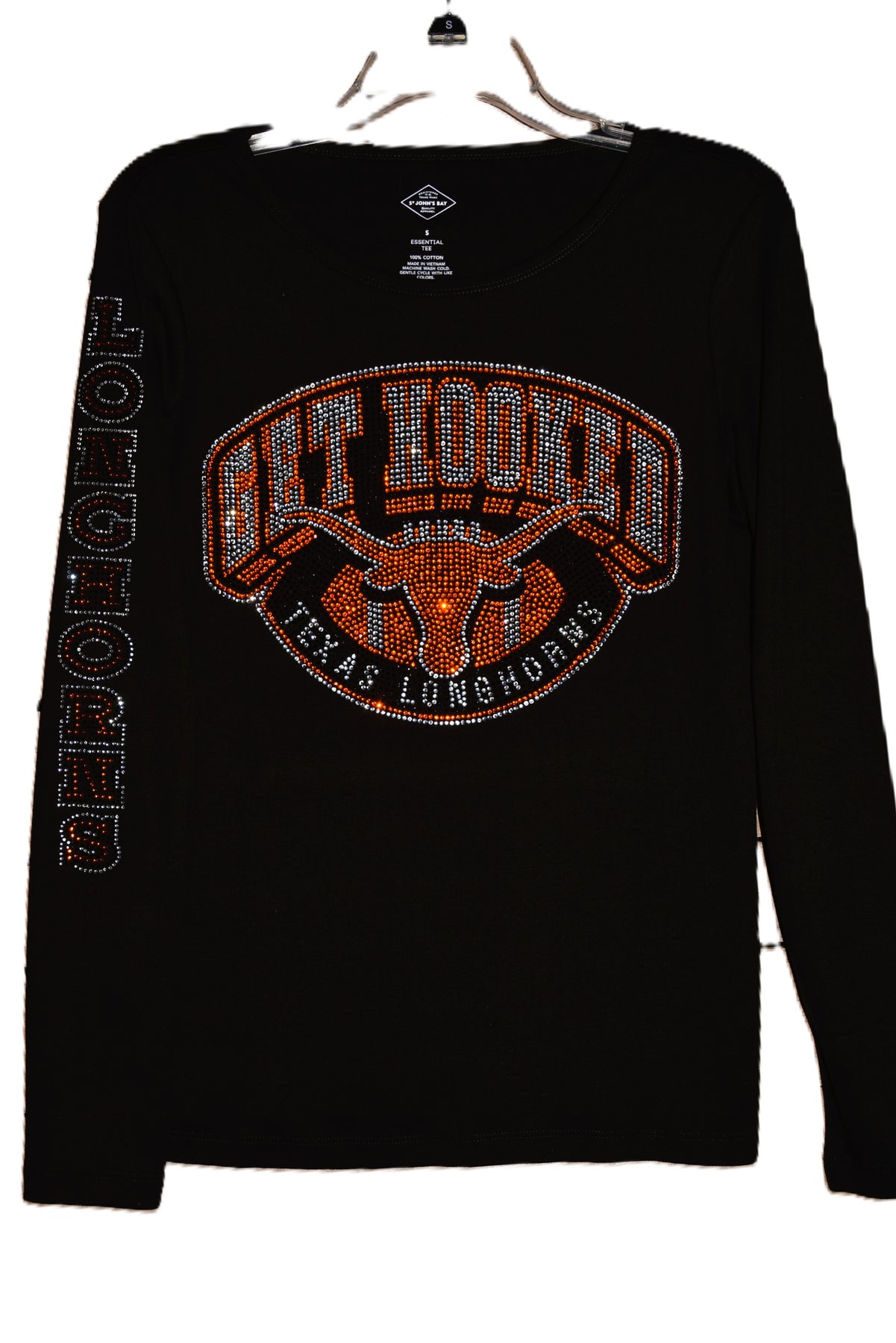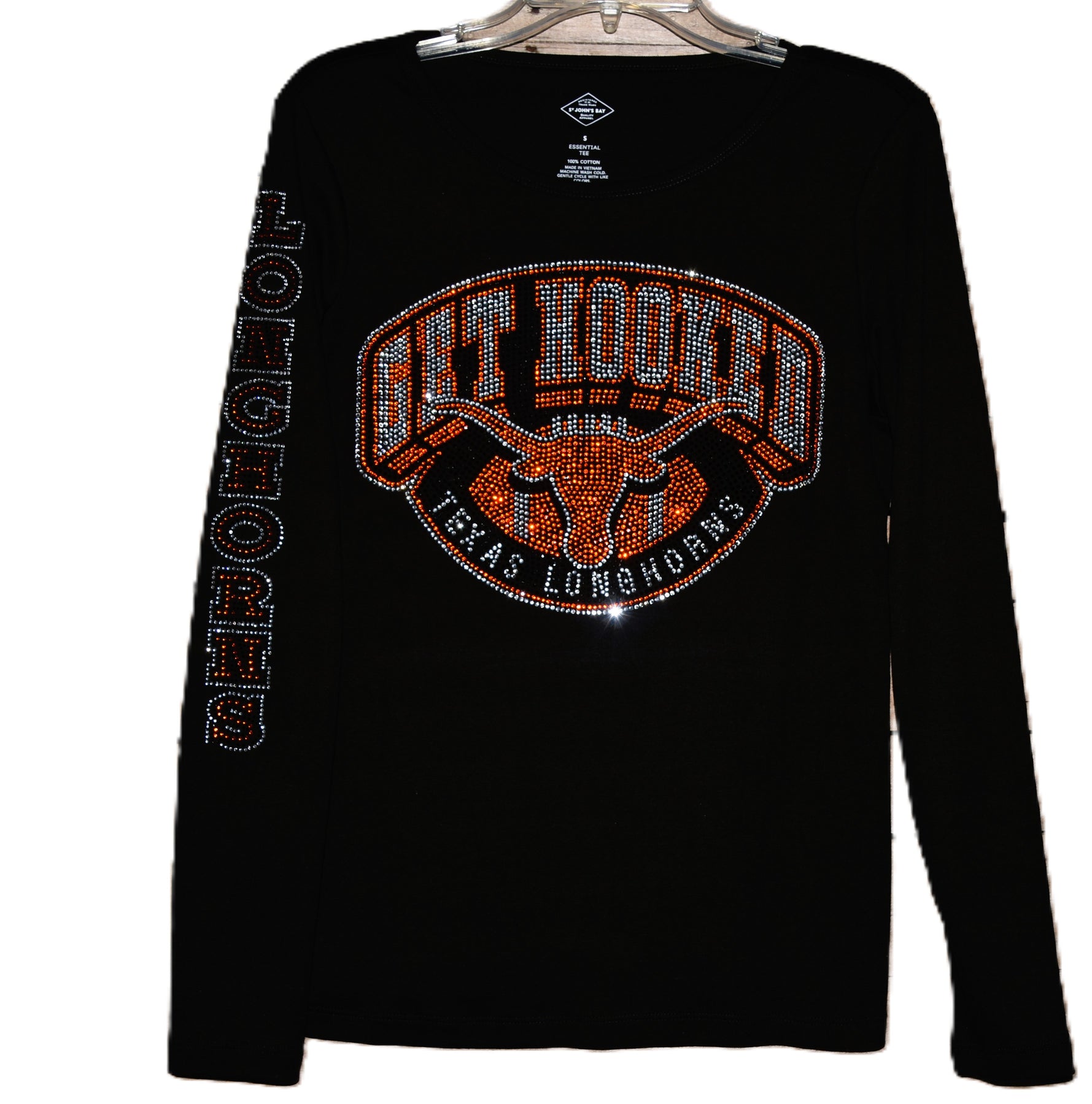 Longhorns rhinestone bling long sleeve black or white shirt with Longhorns on sleeve.