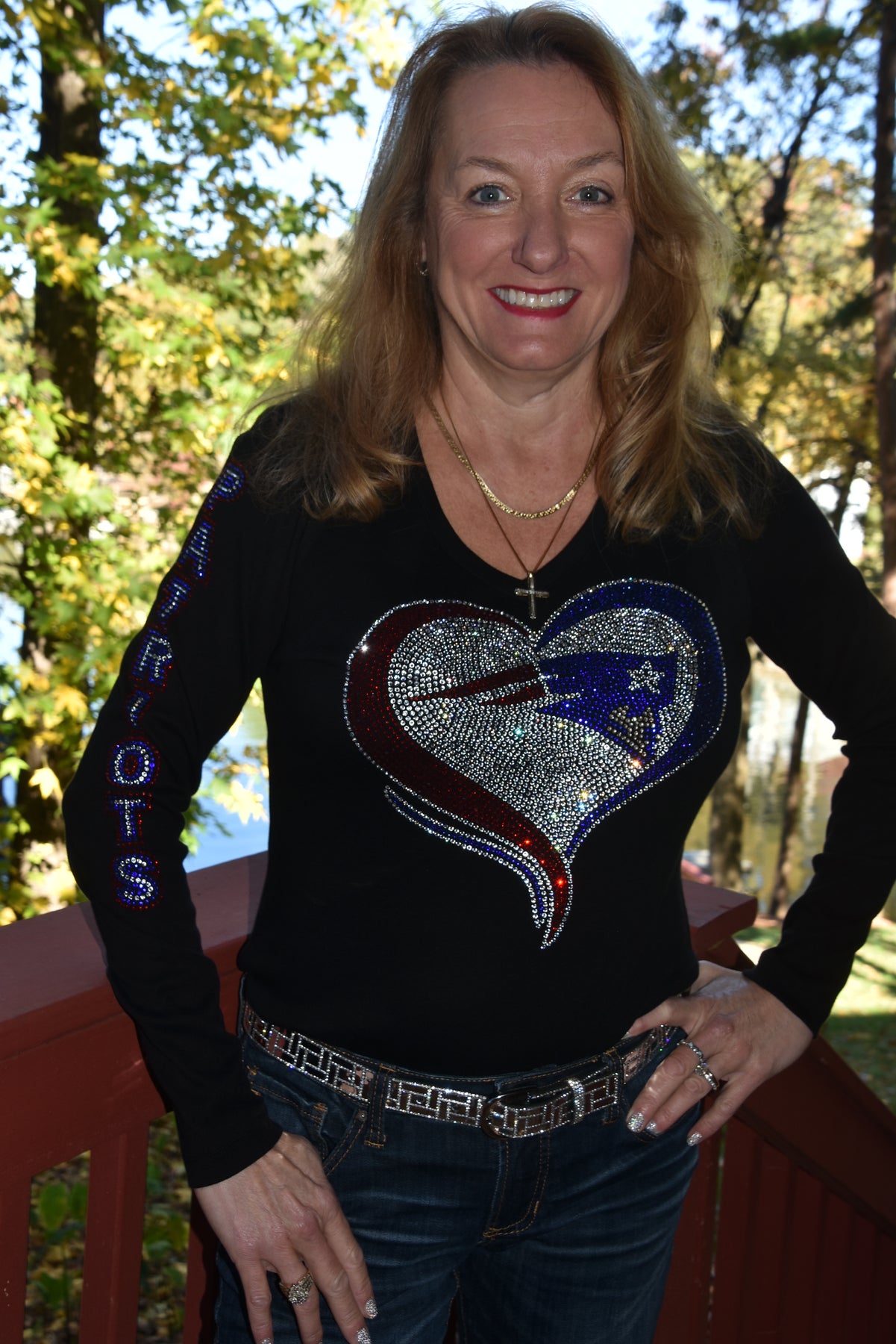 This is a large and ornate rhinestone design with lots of sparkling rhinestones in vivid red, royal blue and diamond clear. There is a large heart shaped Patriots design on front and a coordinating rhinestone Patriots on the sleeve.