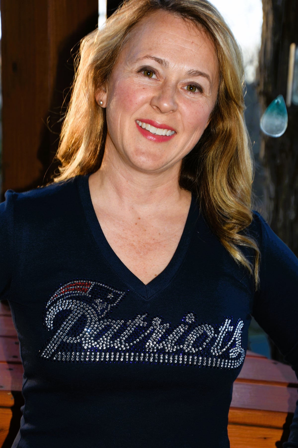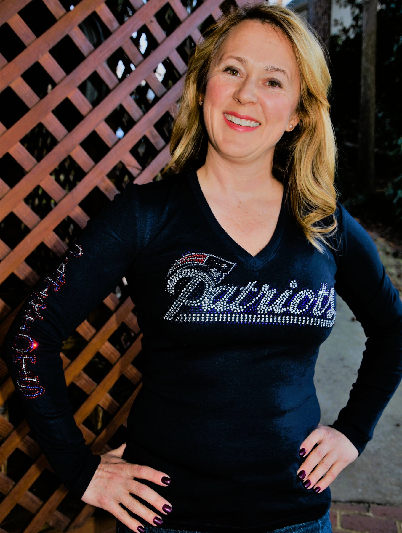 Cheer on your favorite Patriots team in style with this rhinestone bling custom made to order long sleeved shirt.