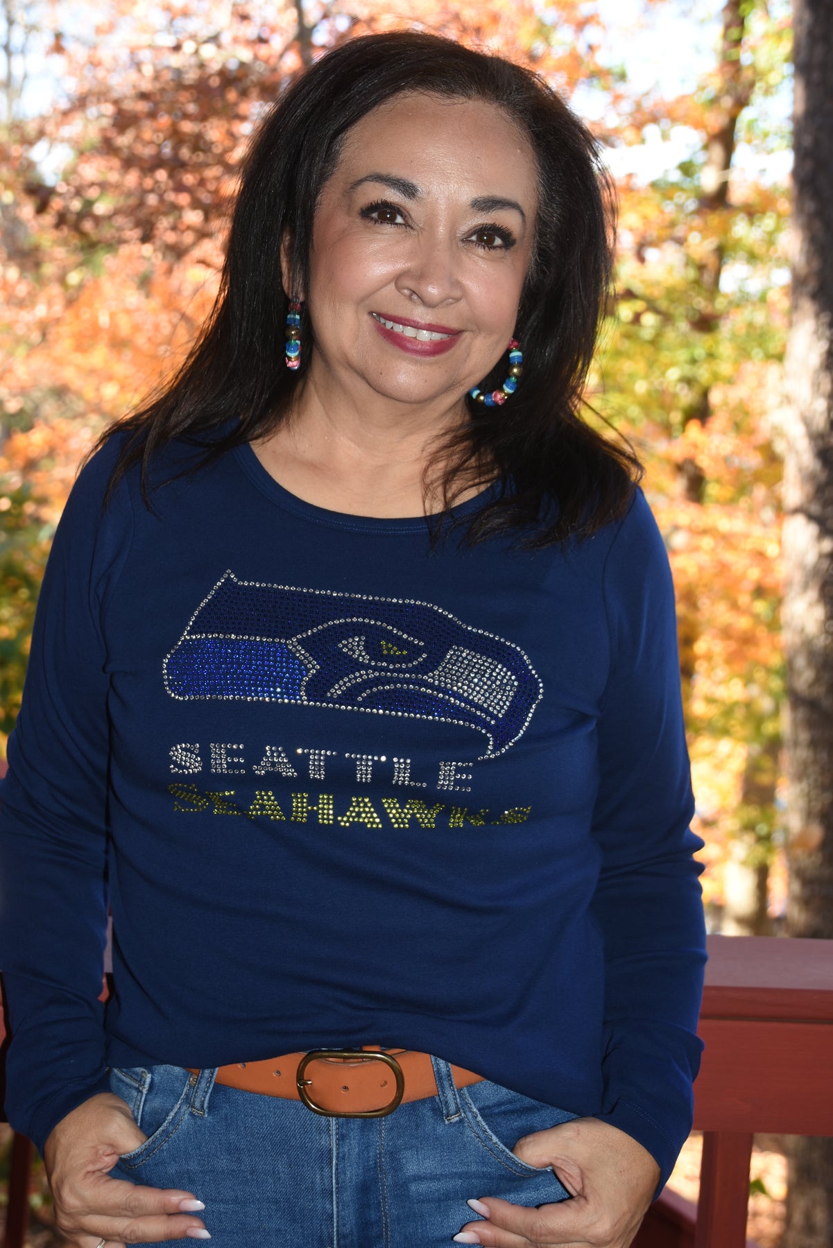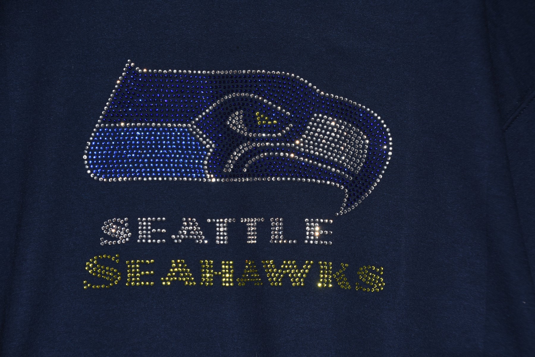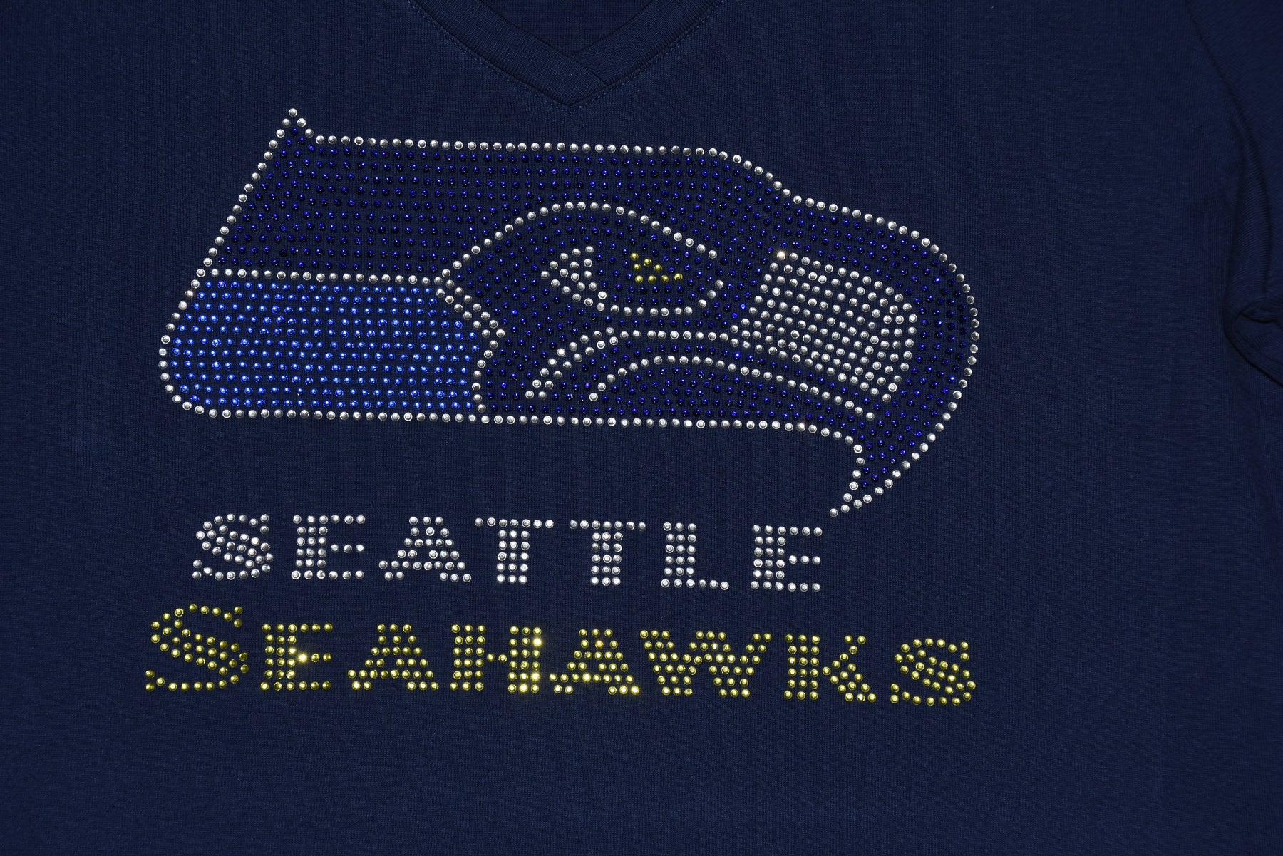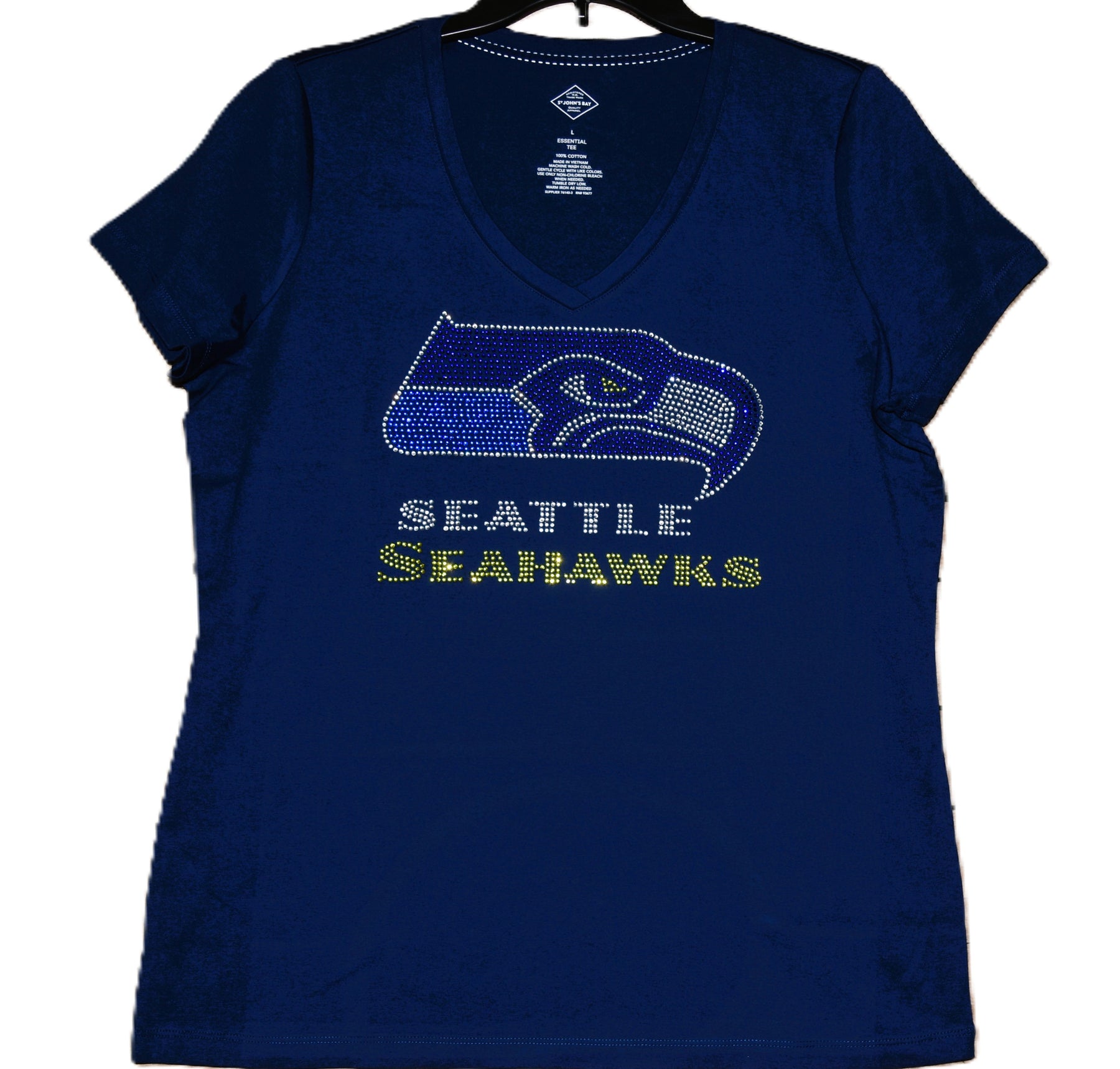 Show your love for your favorite Seahawks football team in style in this first quality rhinestone bling, custom made to order rhinestone bling shirt. This is a beautiful rhinestone design with lots of sparkling vivid blue, green and diamond clear rhinestones.