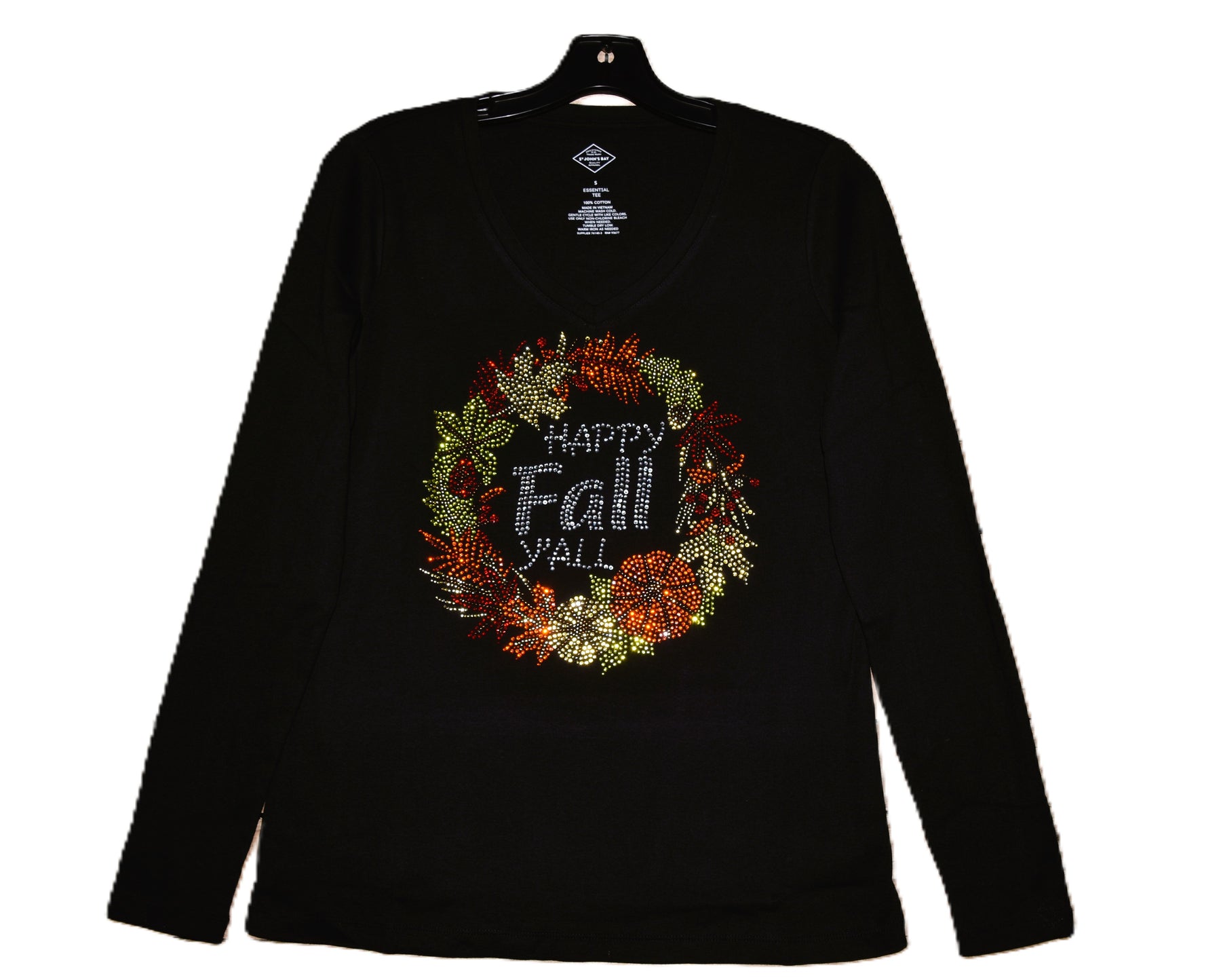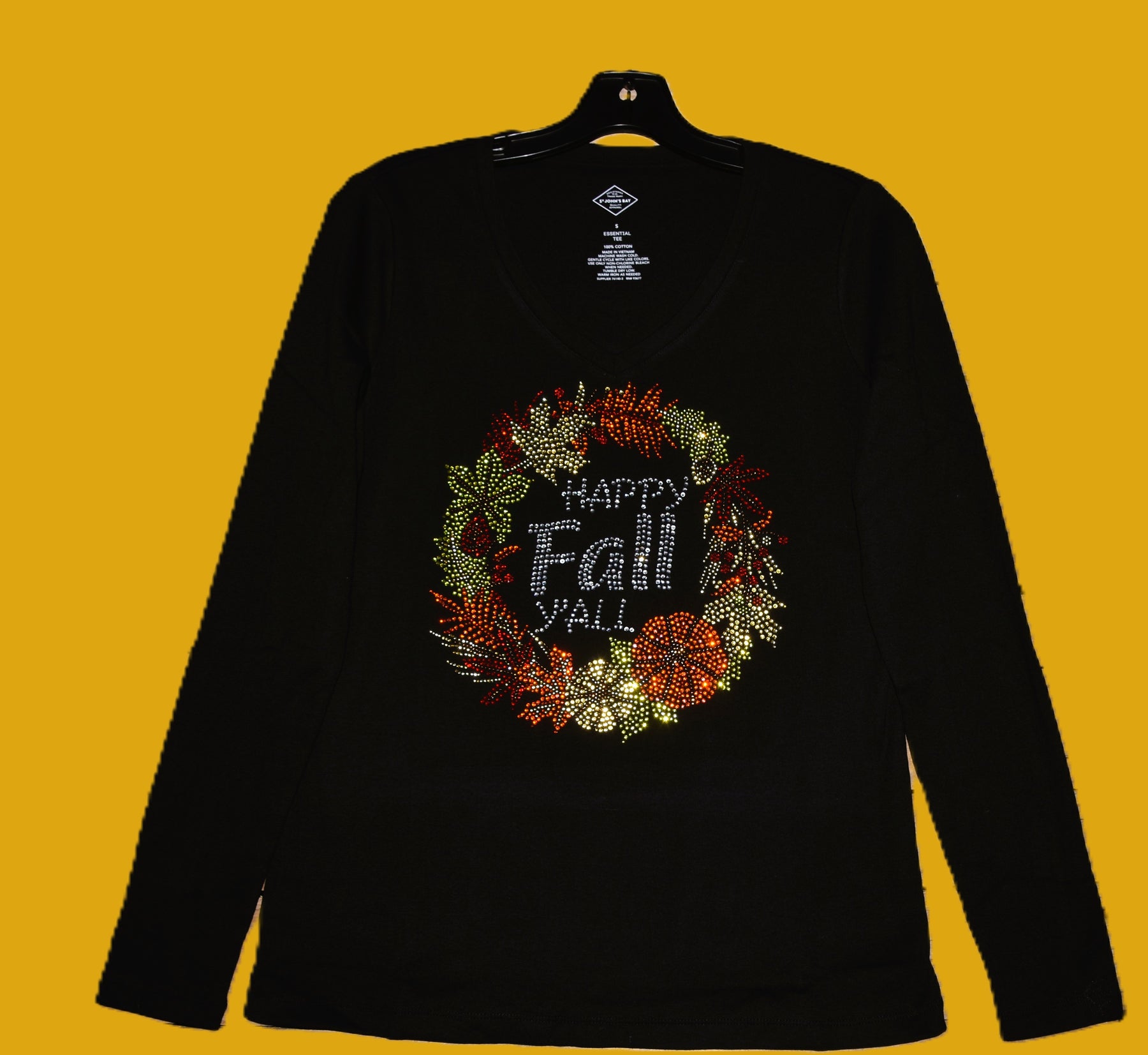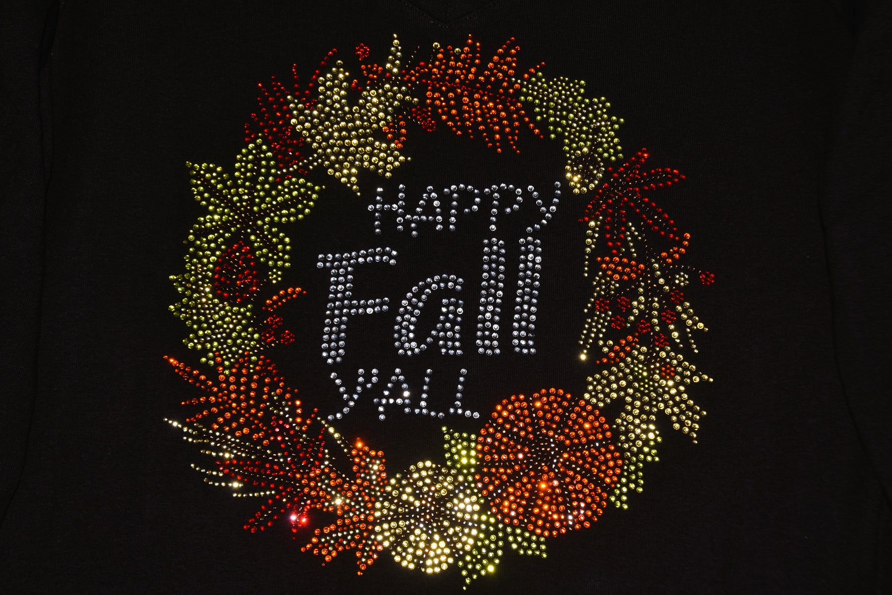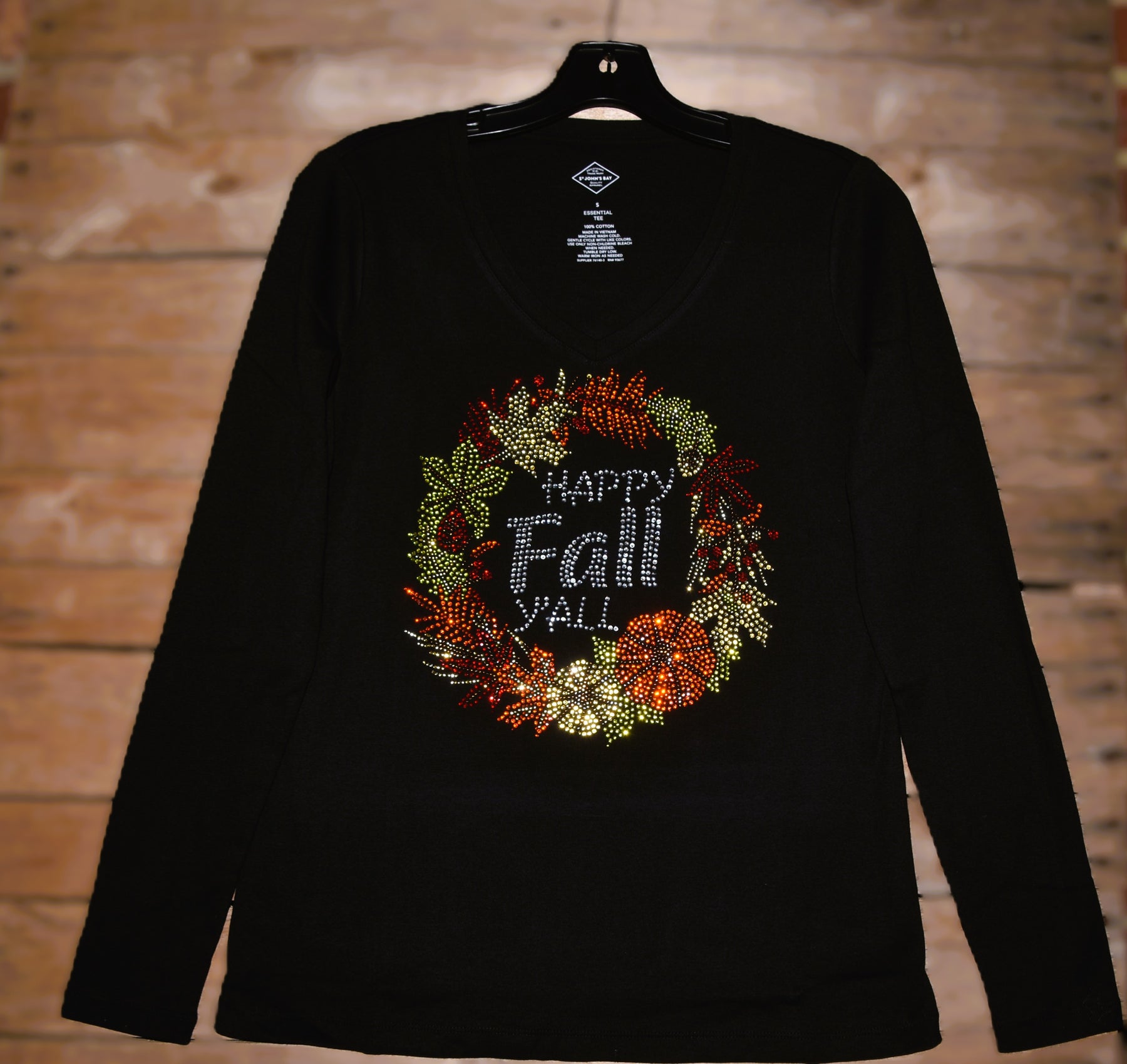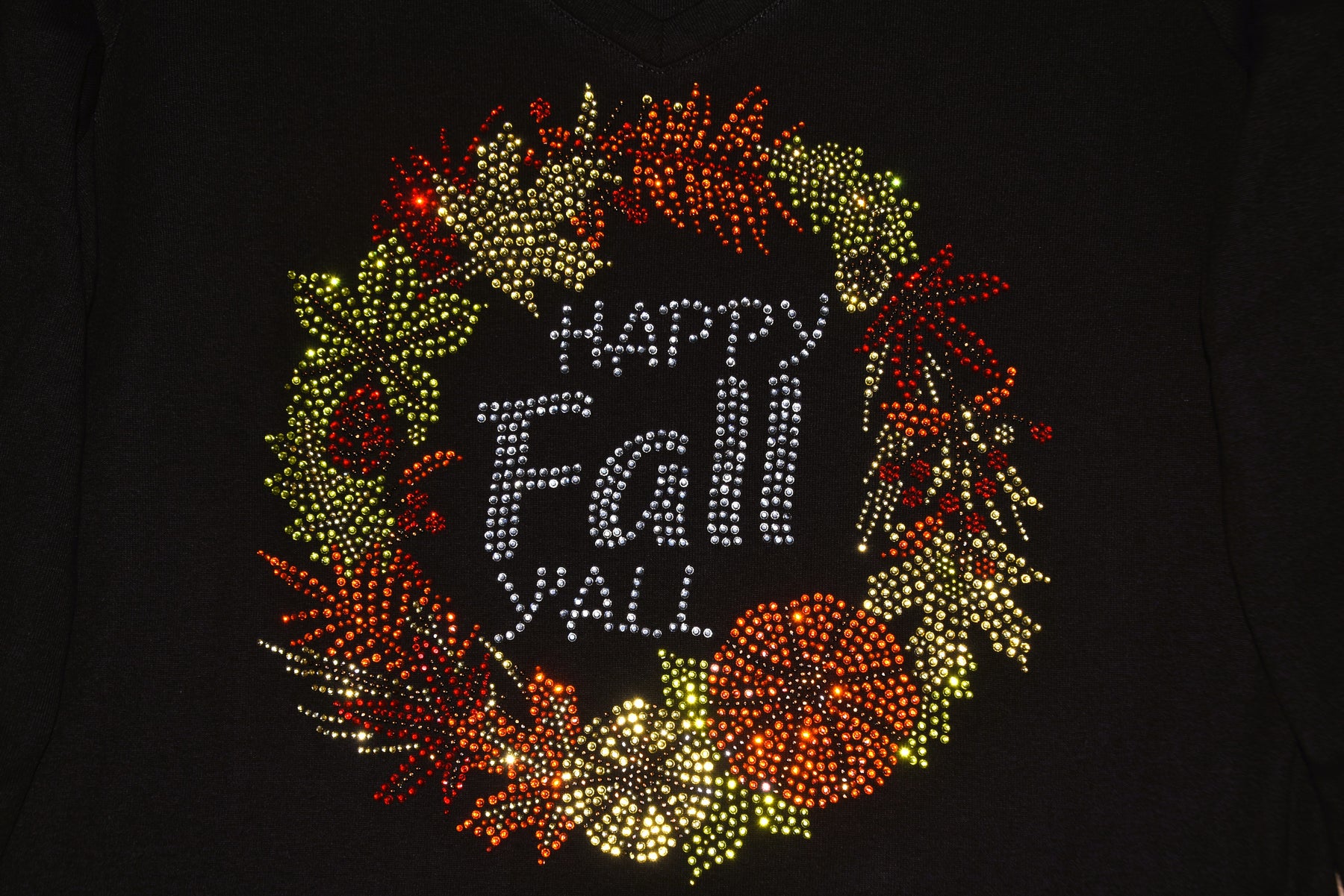 Happy Fall Y'all rhinestone bling short or long sleeved shirt. This is my newest fall design and is my favorite I have created! LOVE the fall colors on full display in this amazing rhinestone design with so much sparkle.