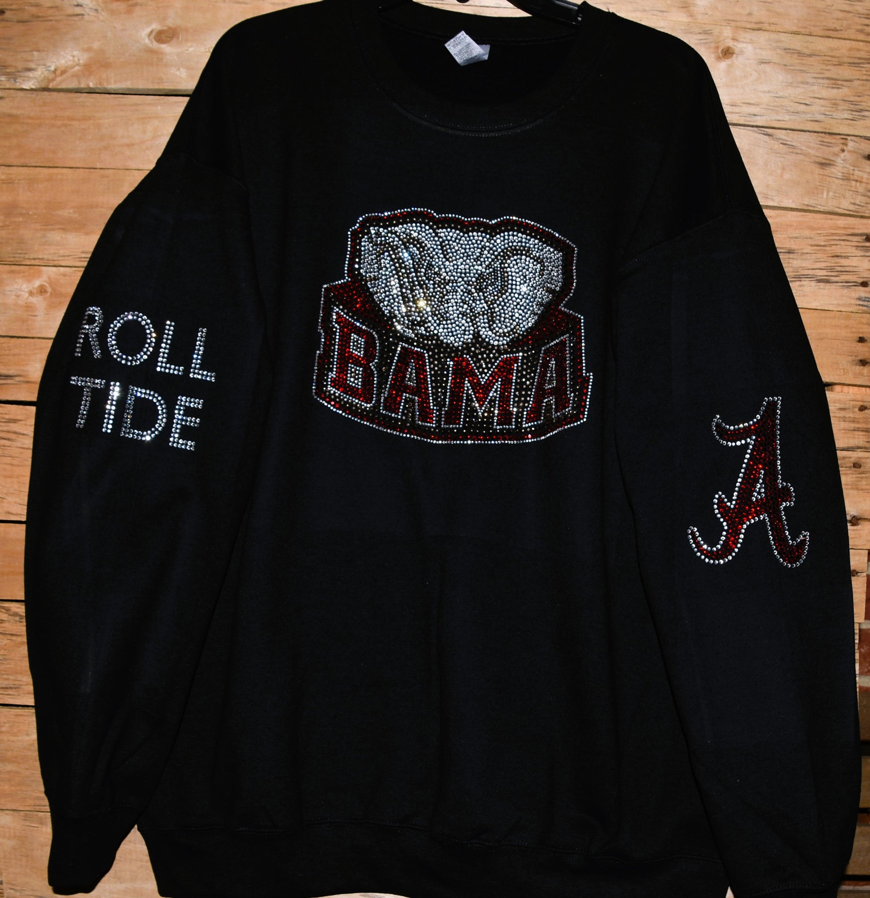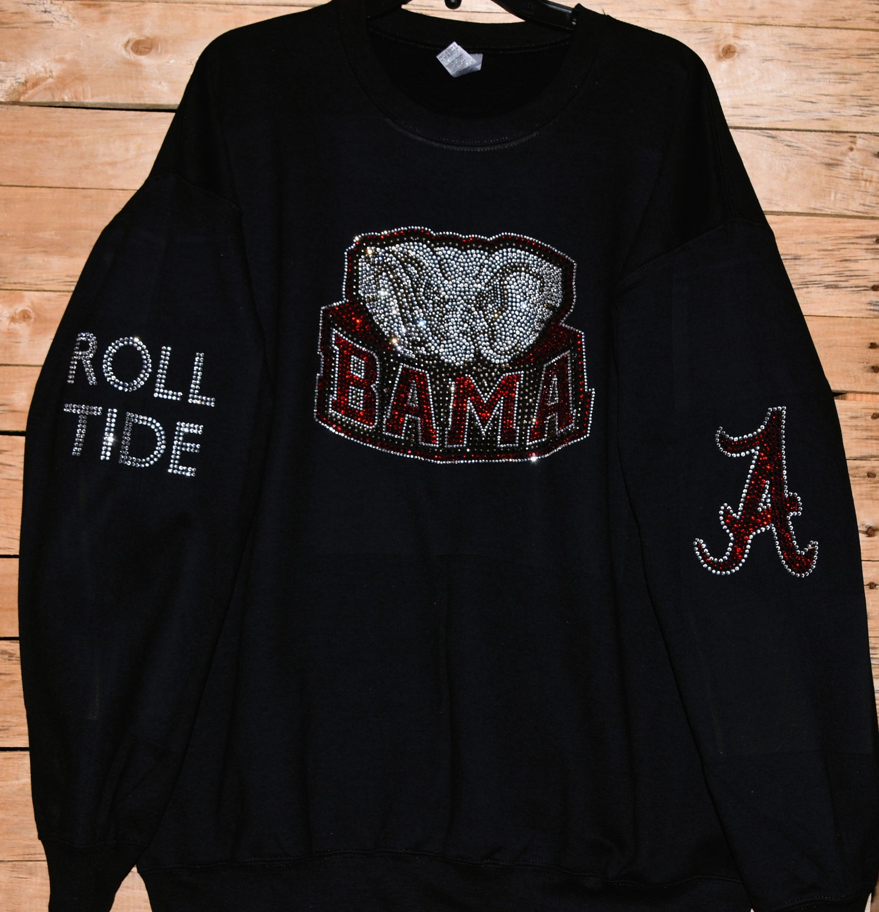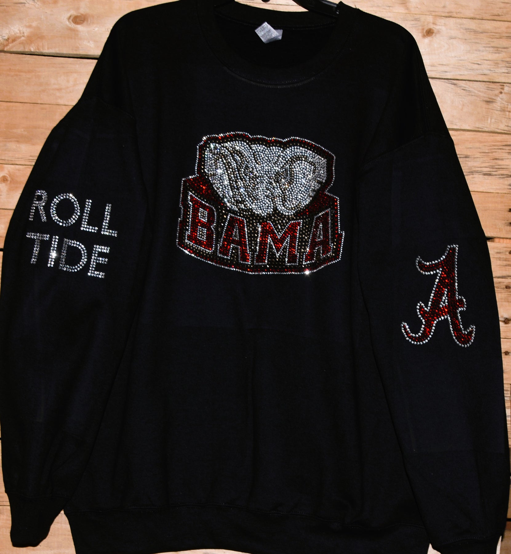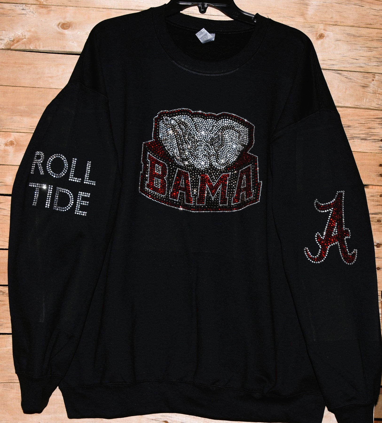 Alabama rhinestone  bling sweatshirt or hoodie featuring a large Alabama rhinestone design on front and a rhinestone design on the sleeve. Photo is of  a sweatshirt.  Can be done on a hoodie or a sweatshirt.