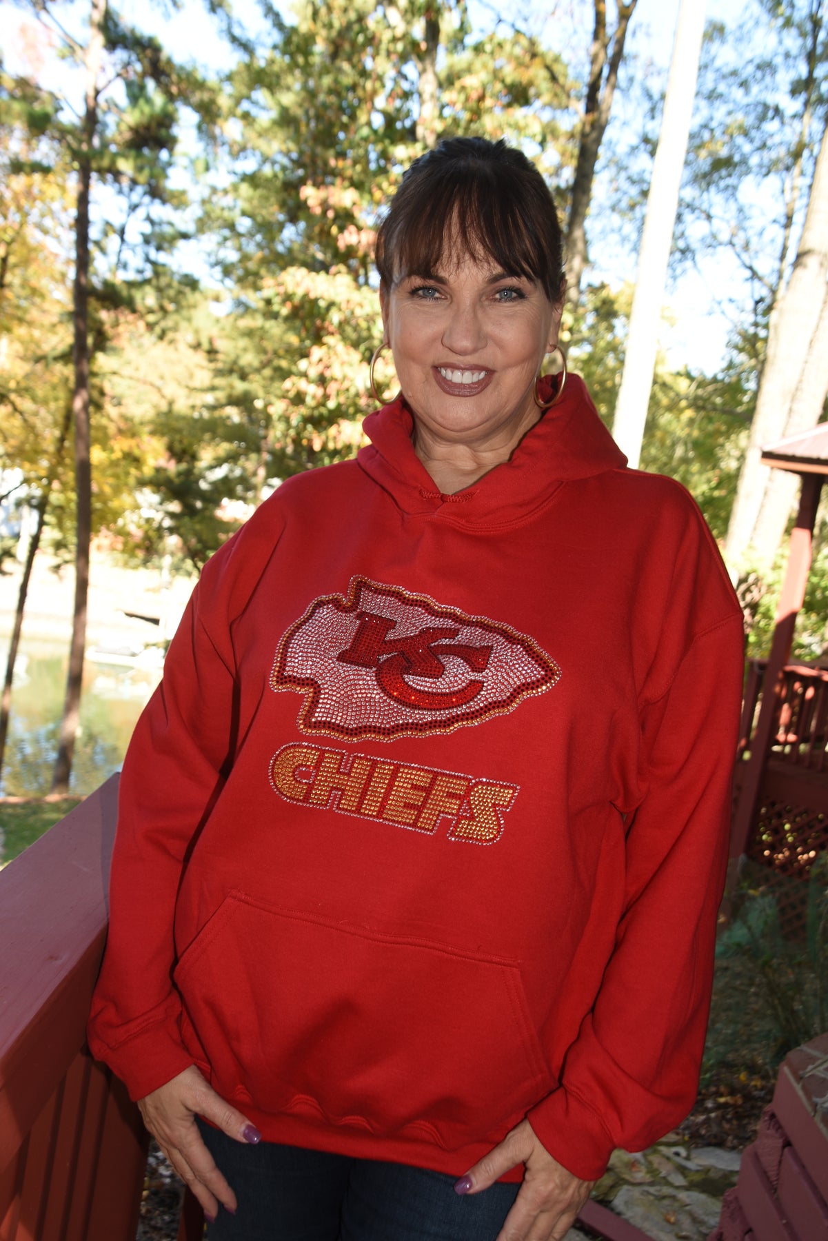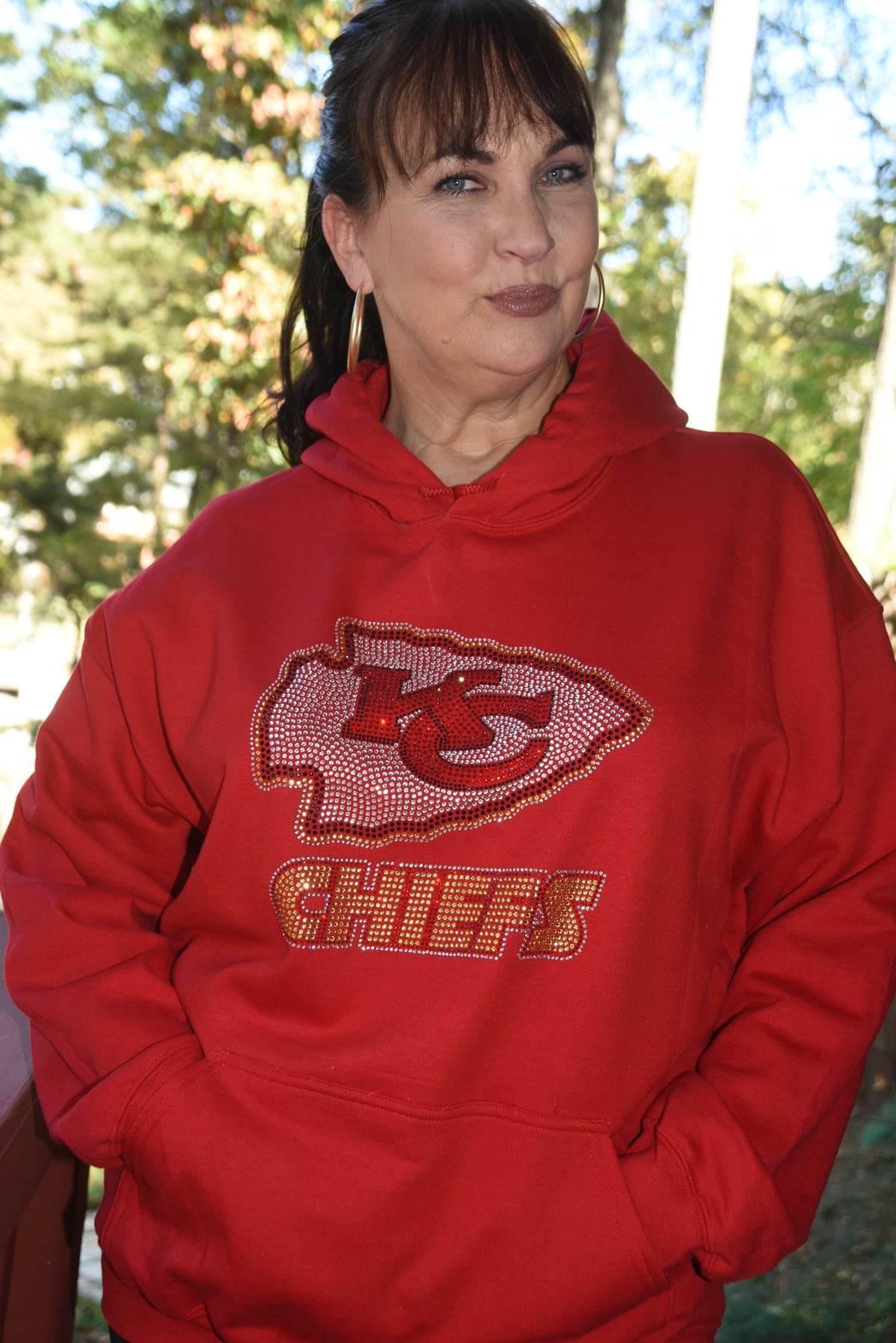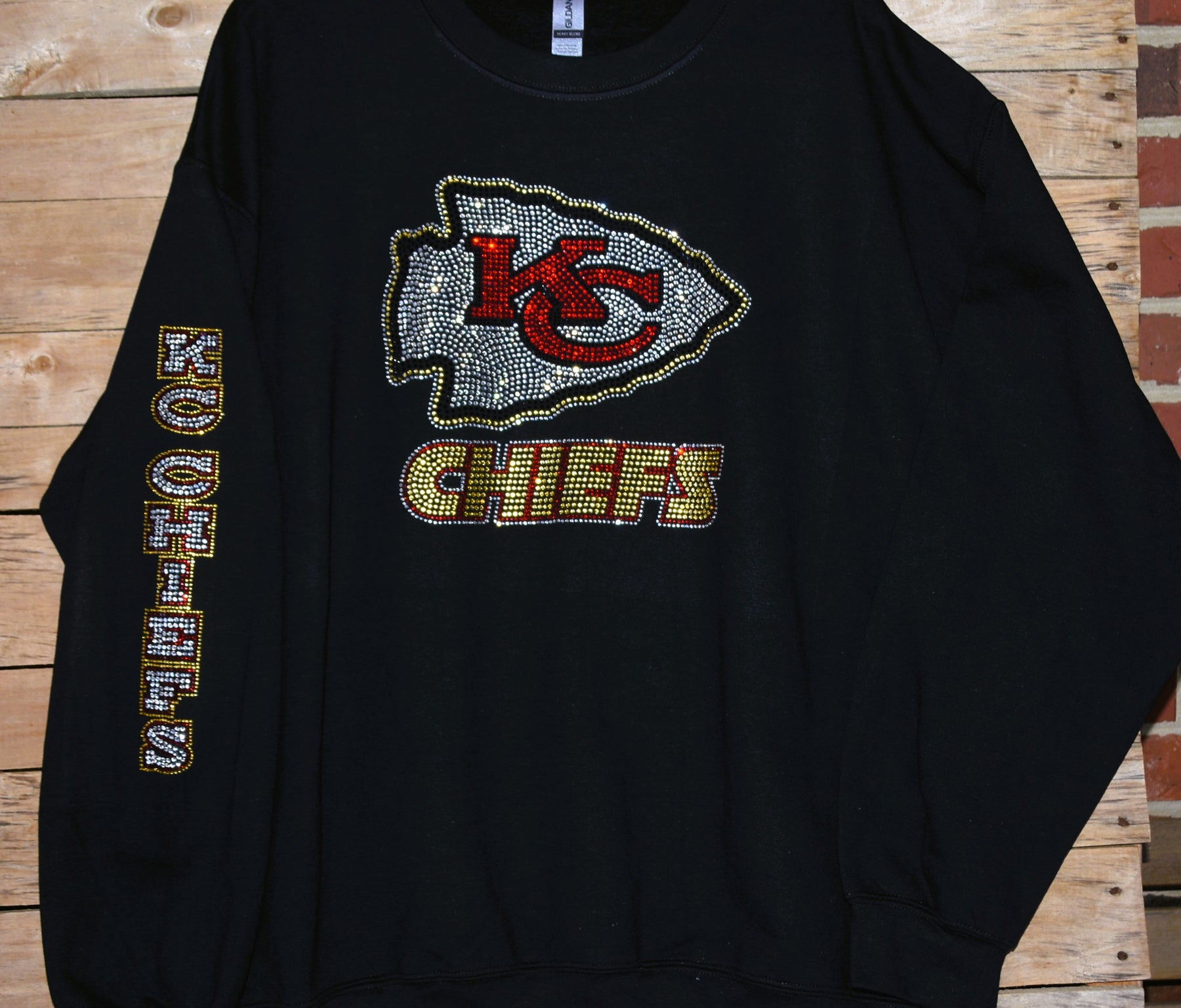 Chiefs rhinestone bling sweatshirt or hoodie with rhinestone Chiefs on the sleeve.