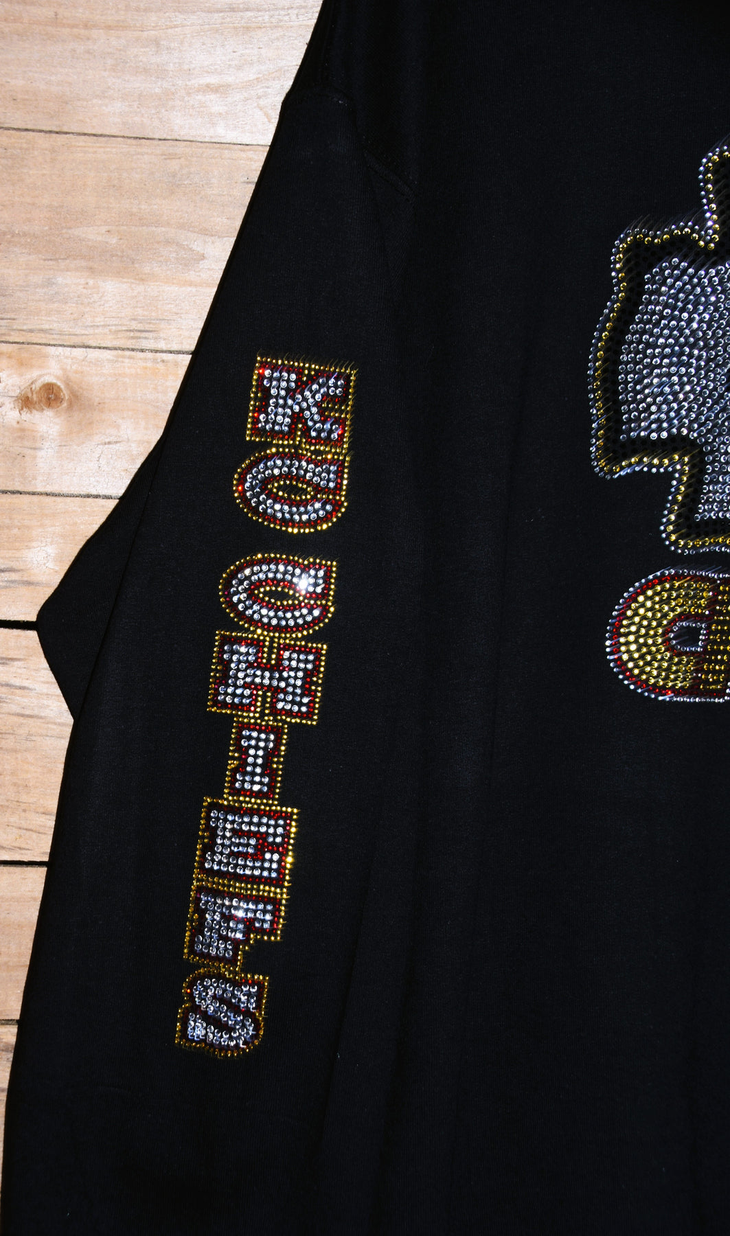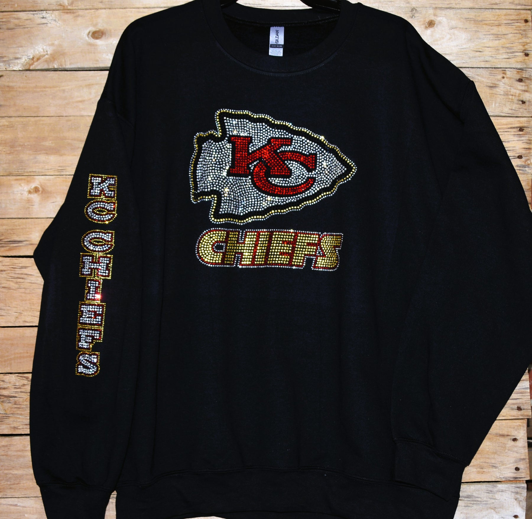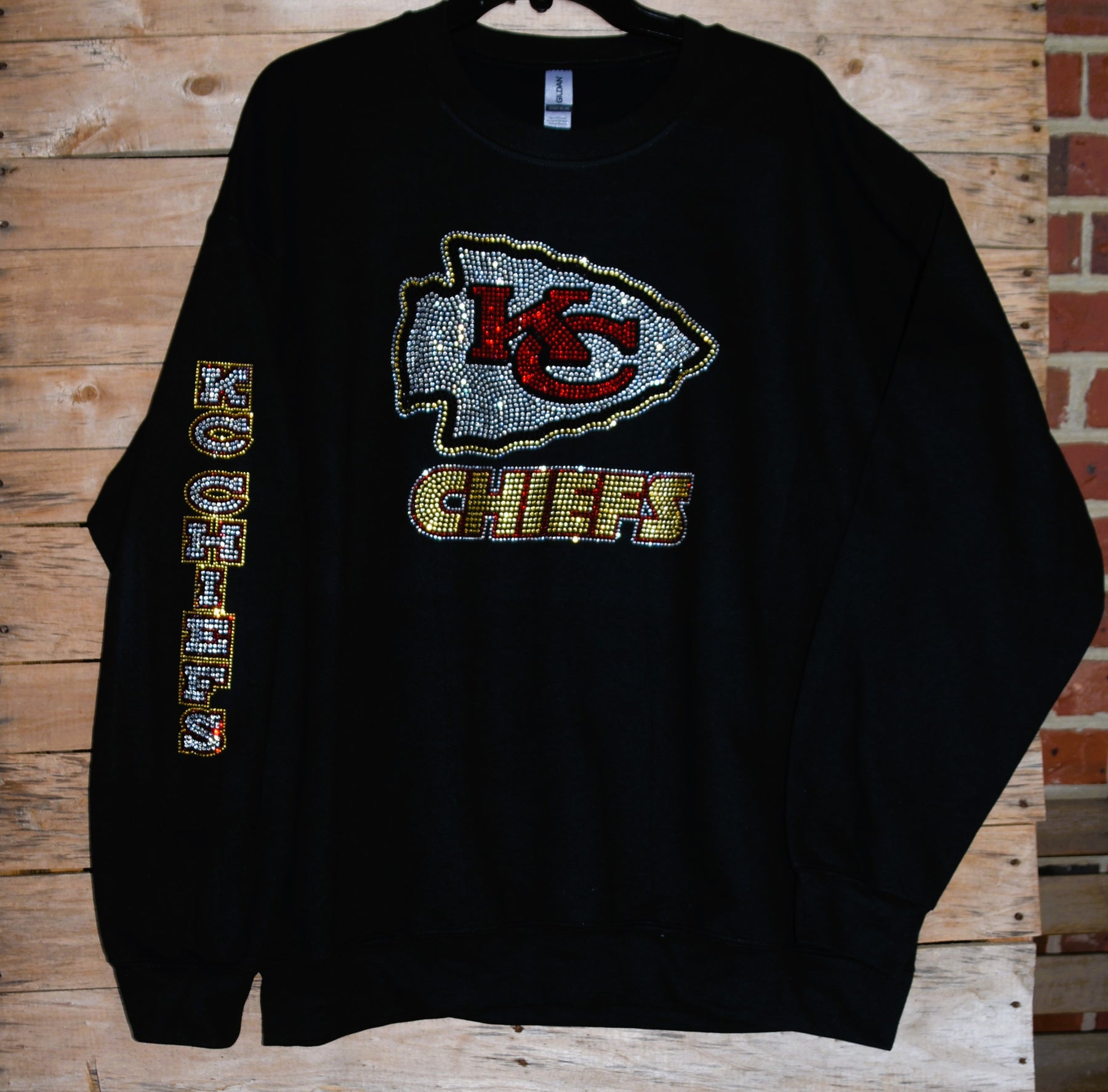Chiefs rhinestone bling sweatshirt or hoodie with rhinestone Chiefs on the sleeve.