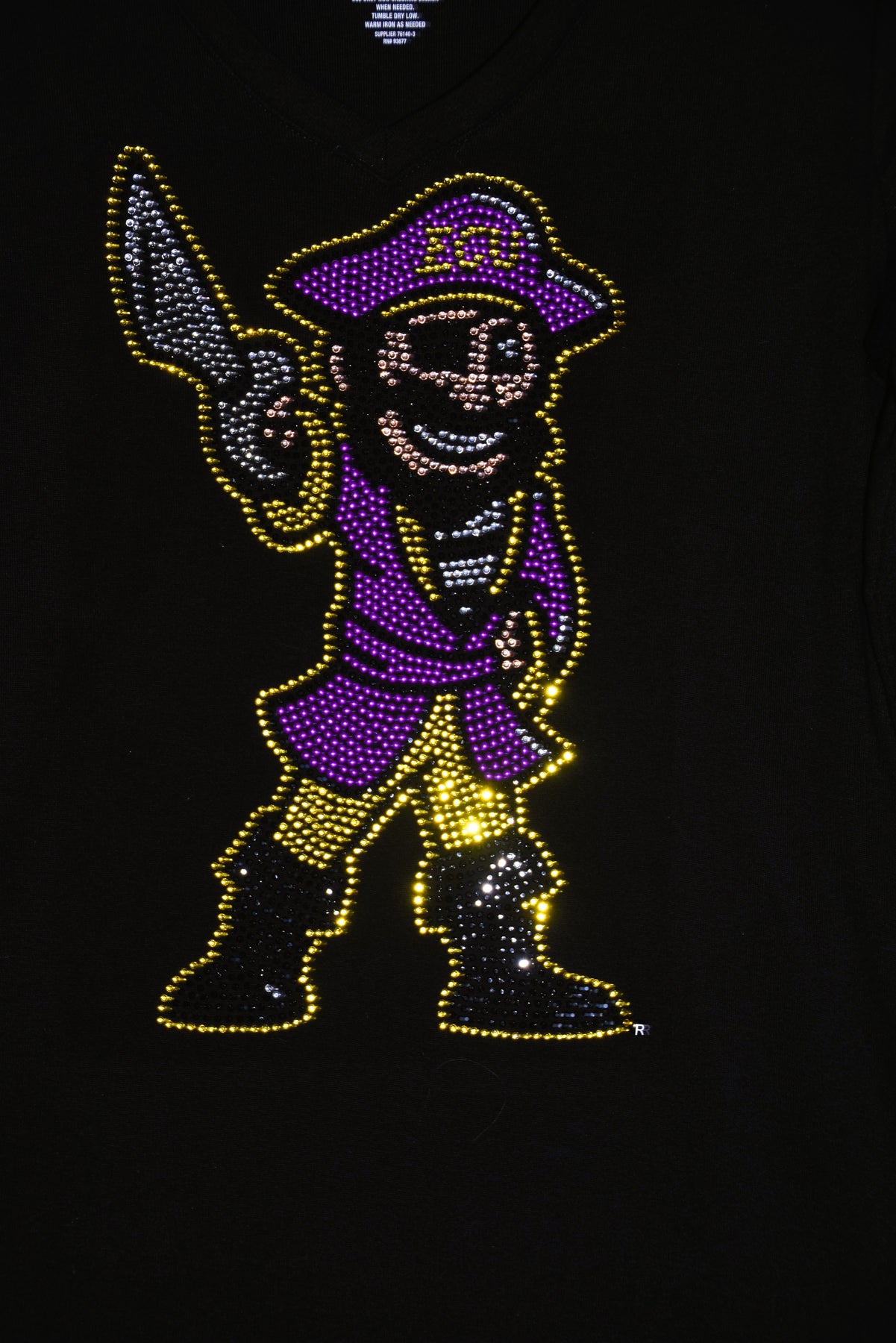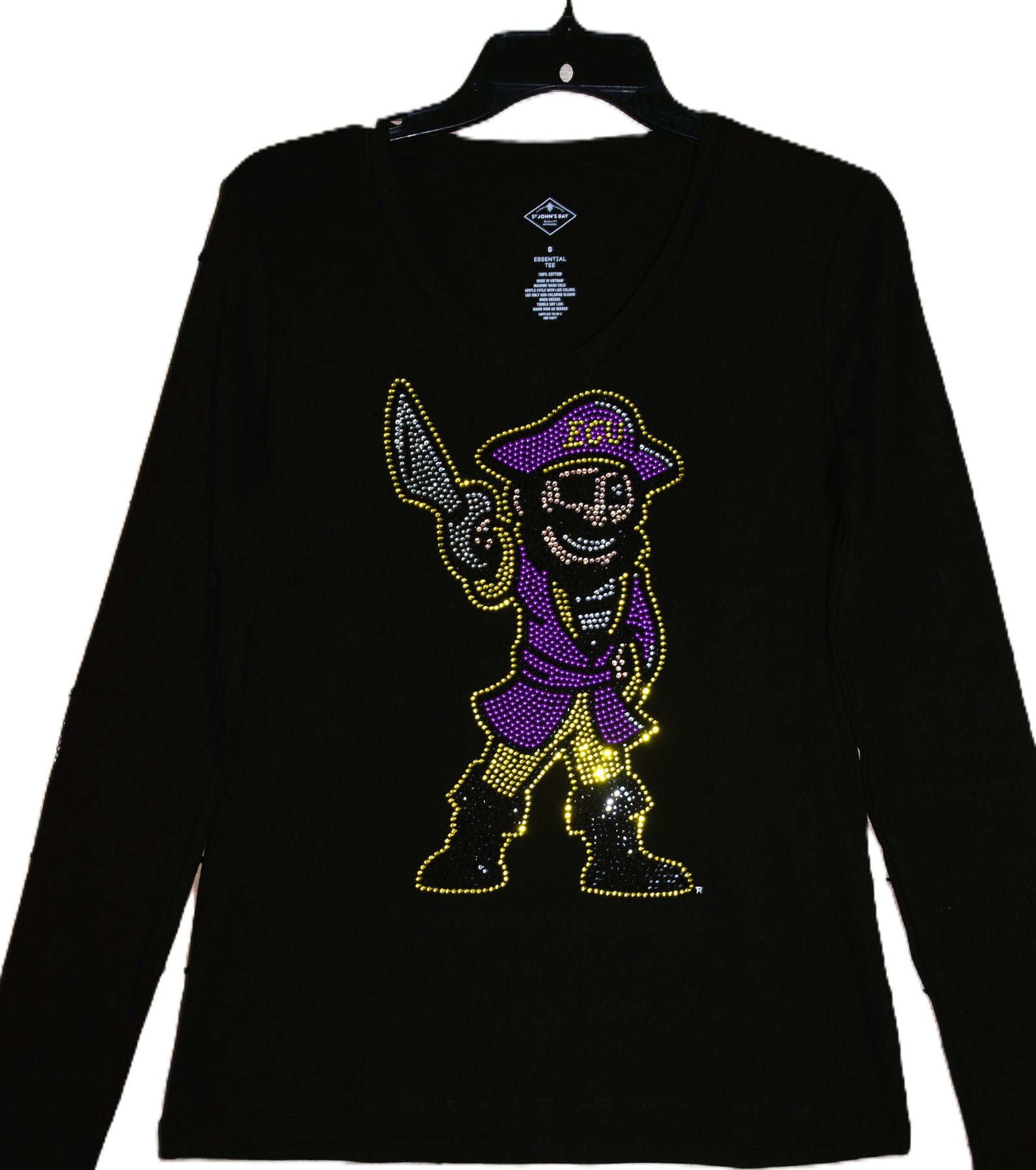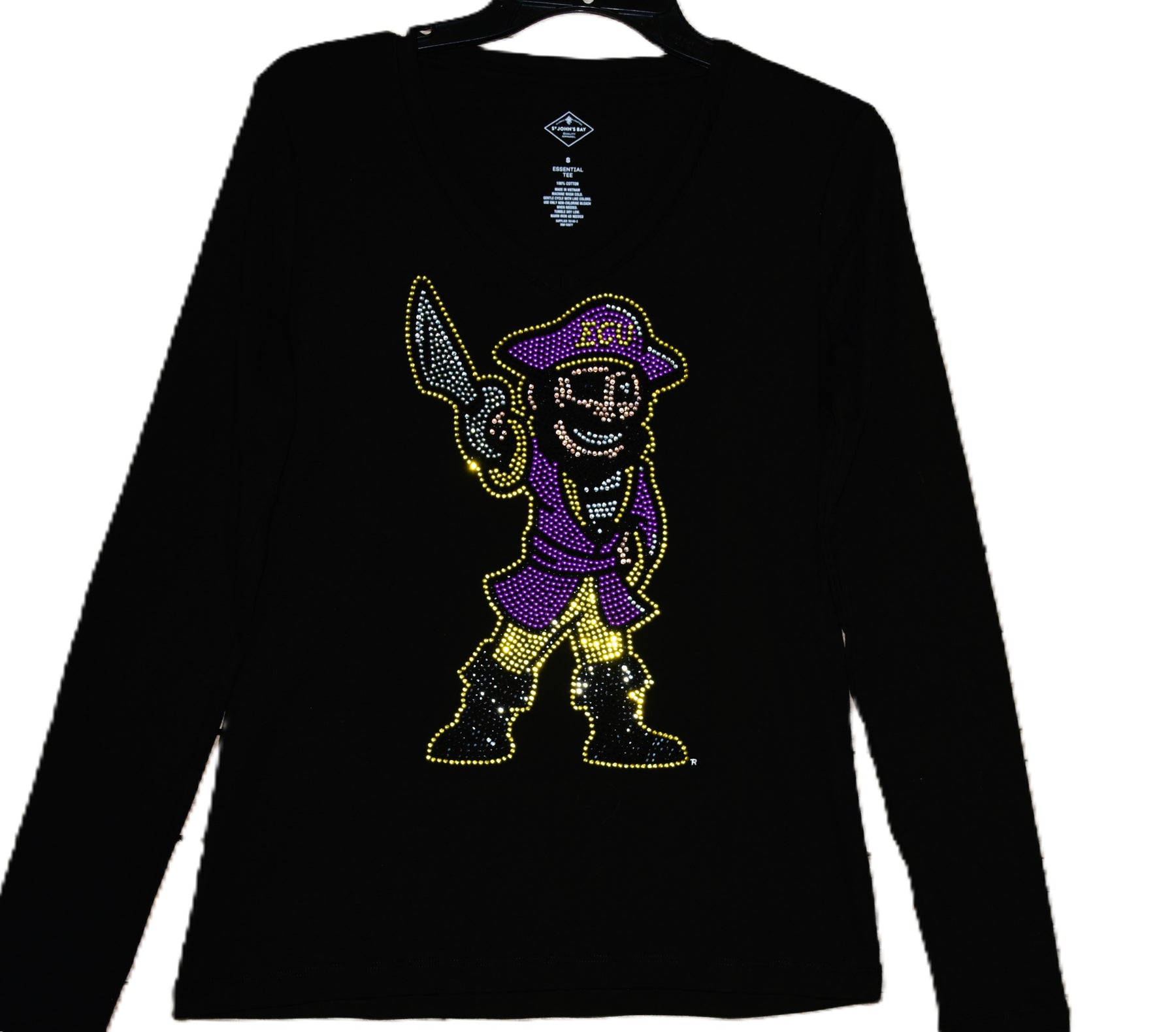 Show off your fun Pirates style in this first quality custom made to order rhinestone & nail head bling shirt. This is a gorgeous design featuring lots of sparkling nail heads & rhinestones in the ECU logo in the shape of North Carolina. I am a licensed crafter for ECU through CLC (Collegiate Licensing Company) as Carolina Bling Queen..