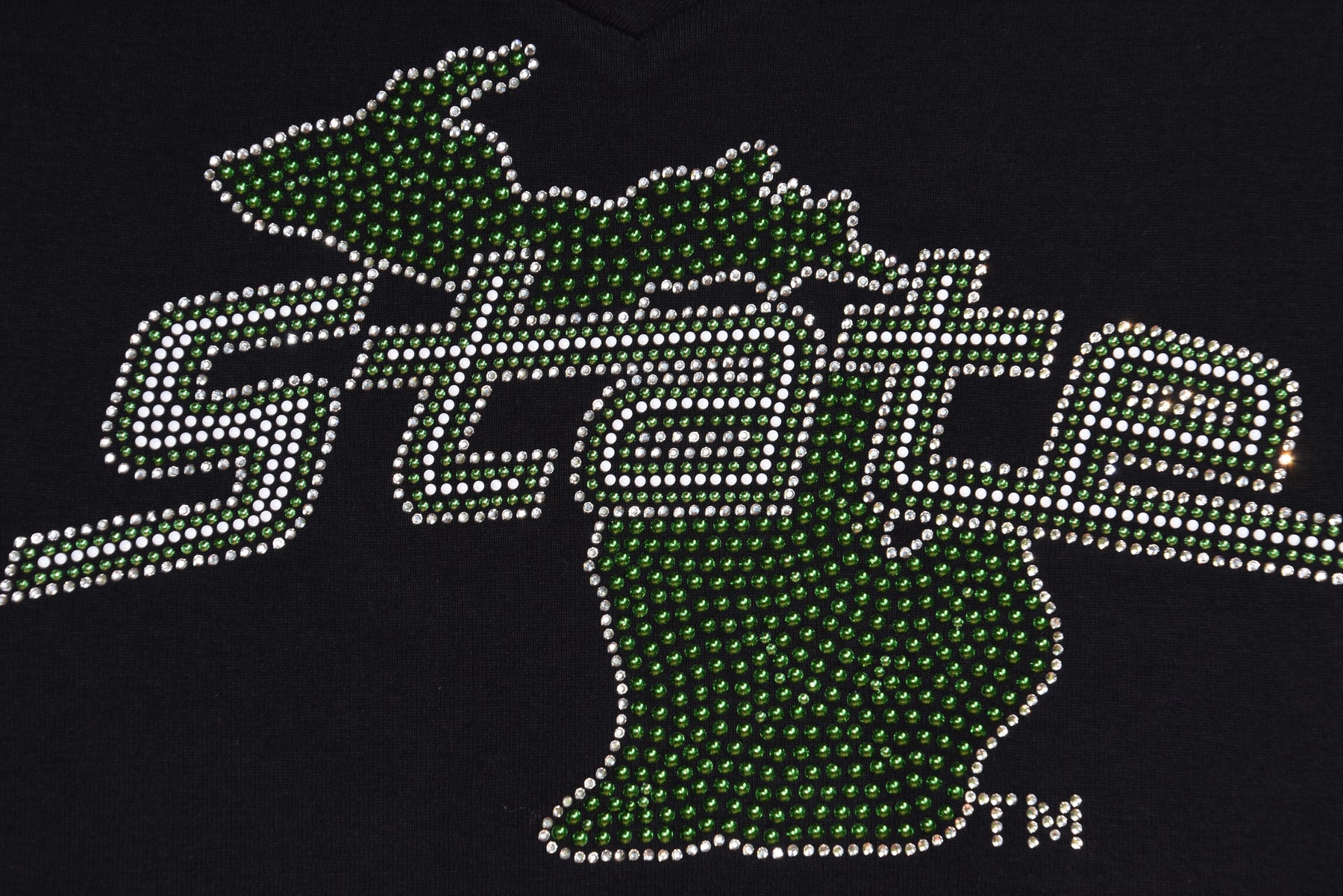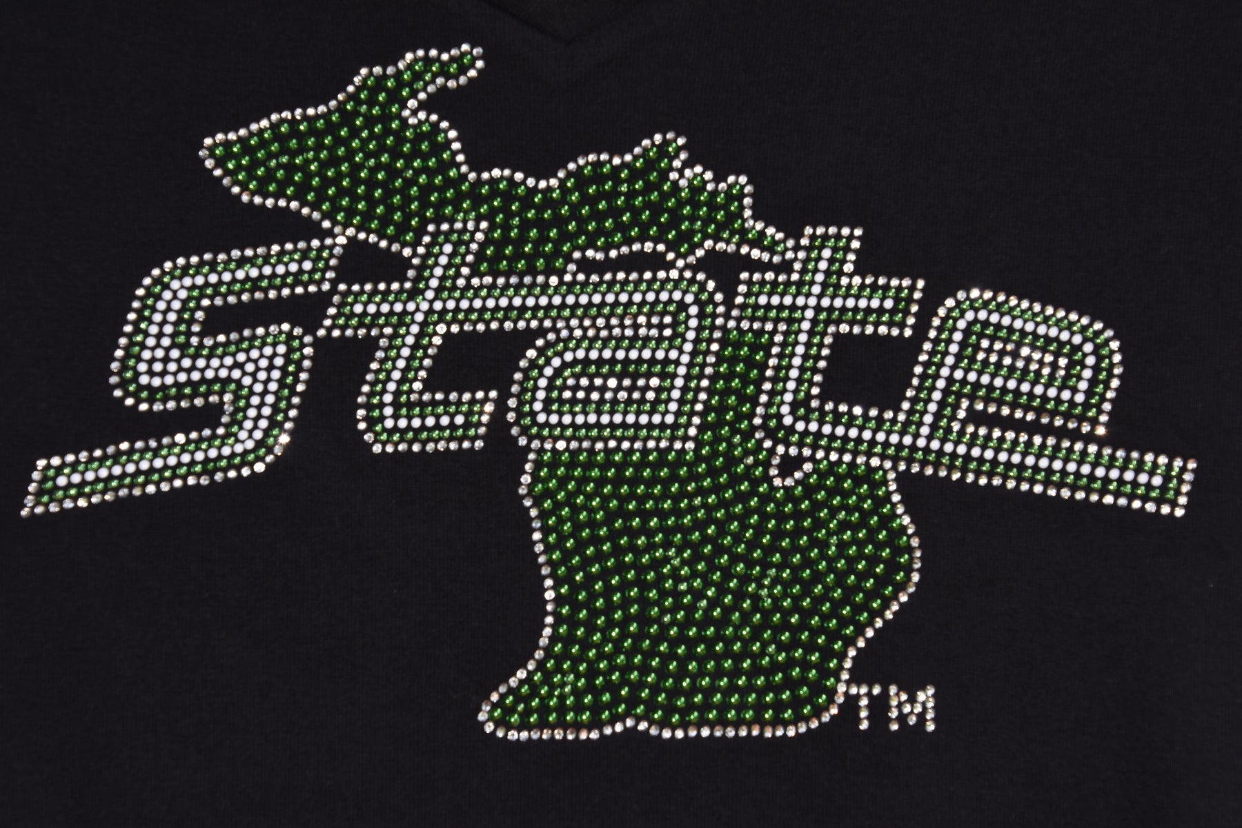 Show your love for your favorite Spartans team in style in this first quality rhinestone bling, custom made to order rhinestone bling shirt. This is a beautiful rhinestone design with lots of sparkling Spartan green rhinestuds, white nailheads and diamond clear rhinestones.