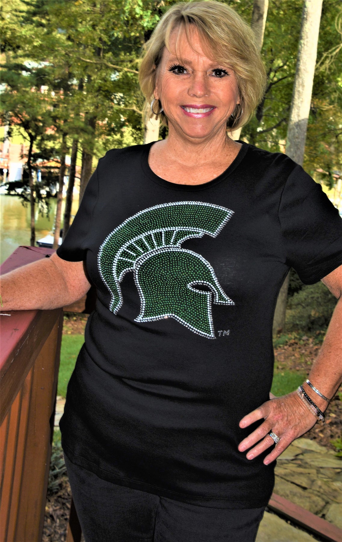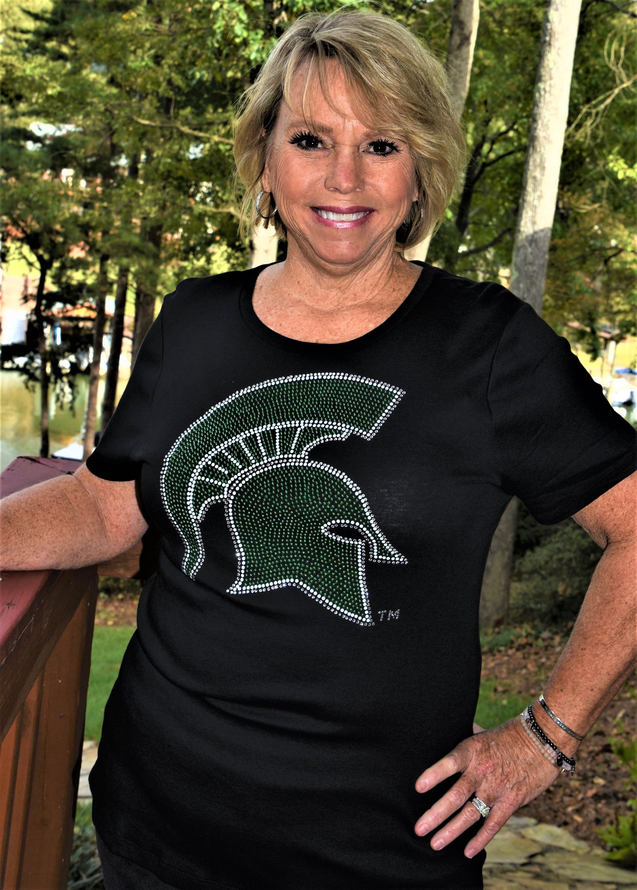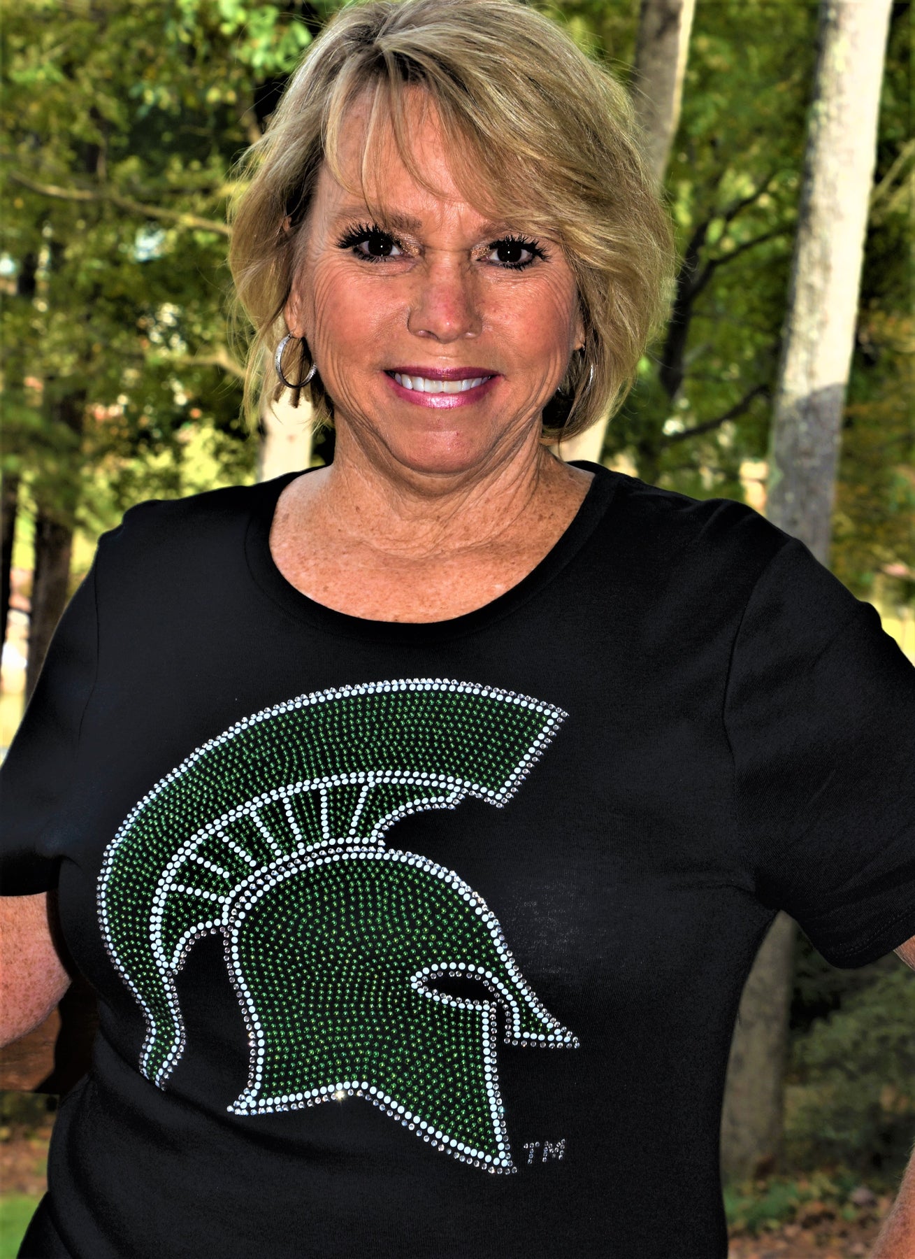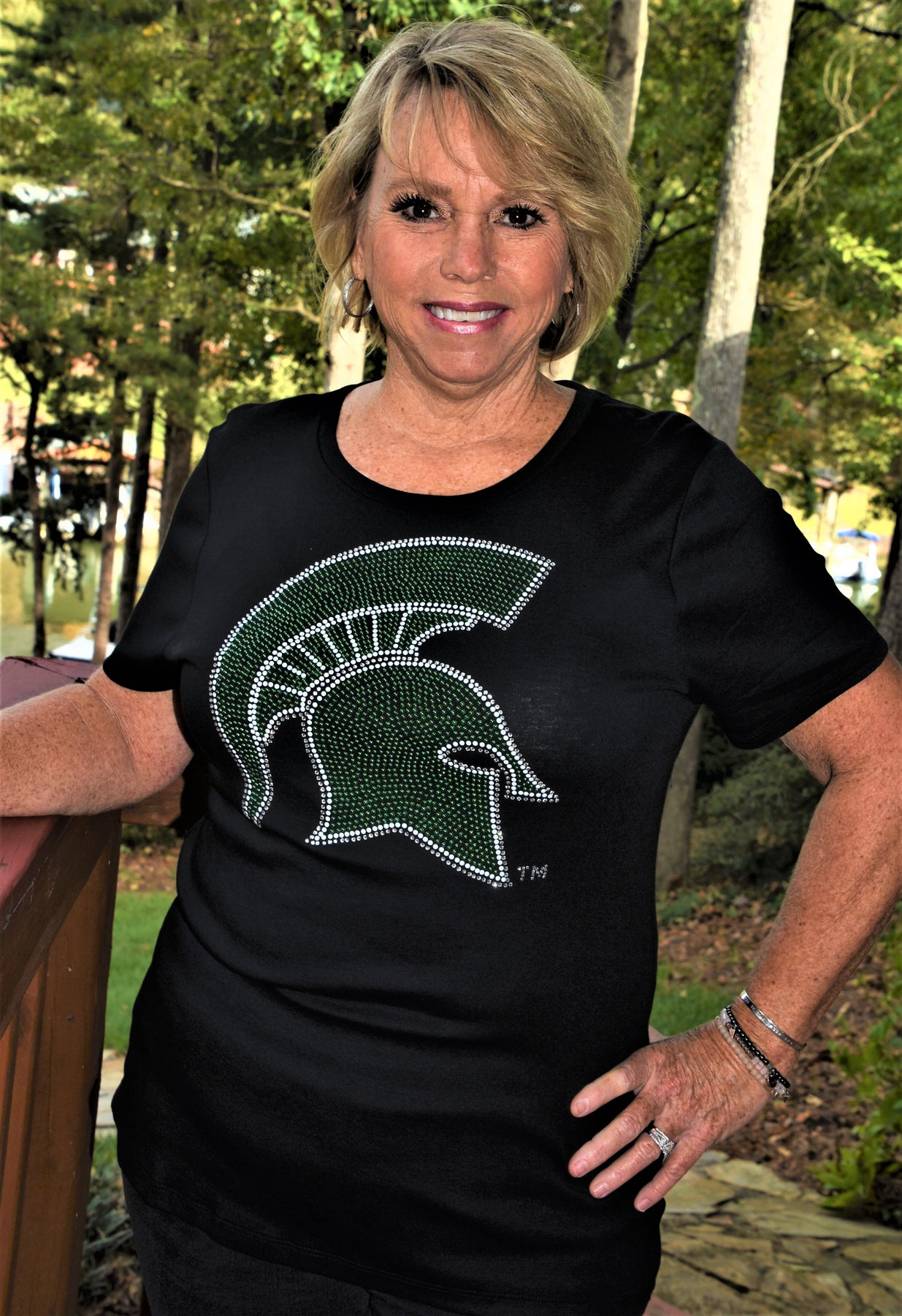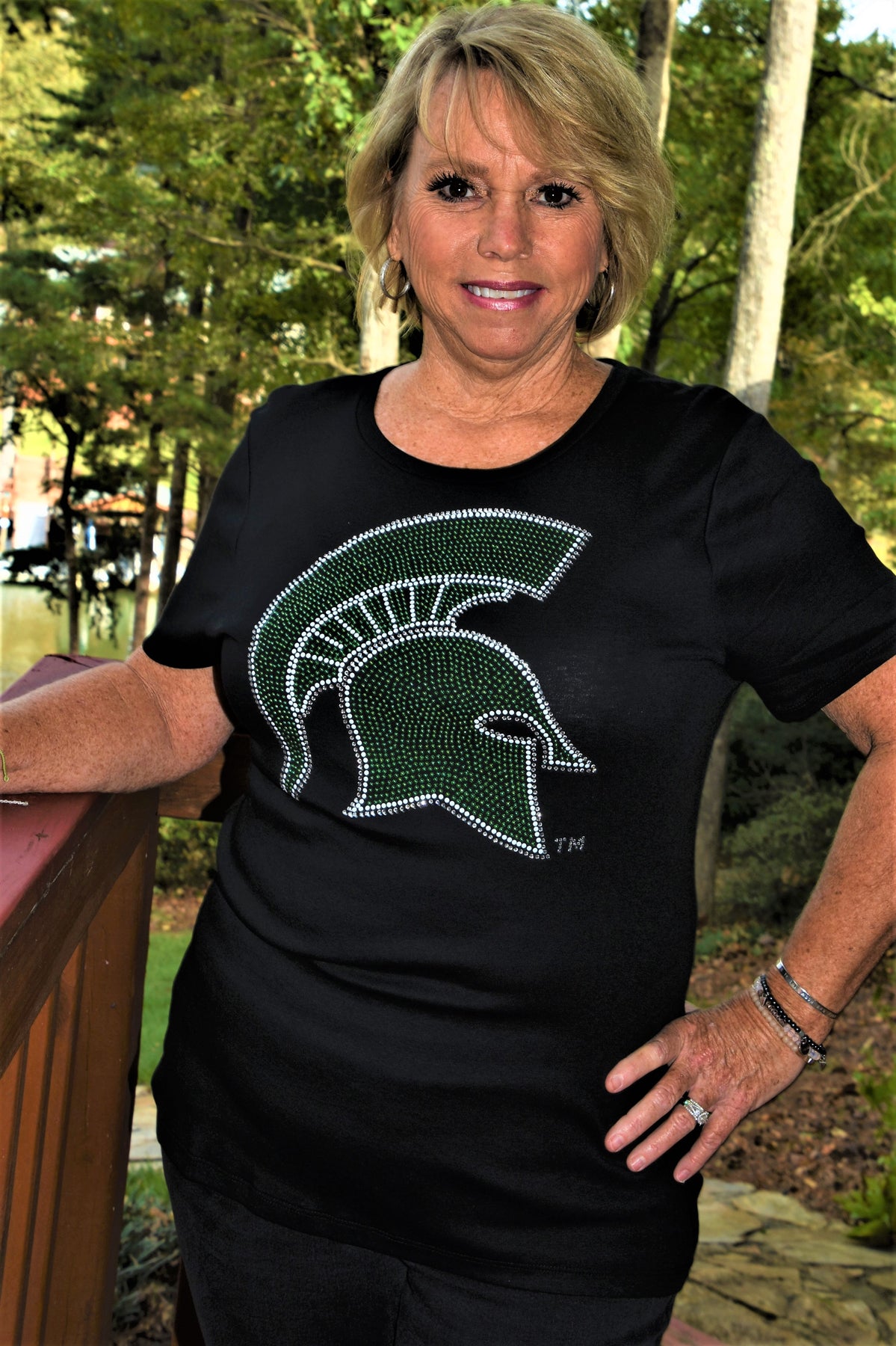 Show your love for your favorite team in style in this first quality rhinestone bling, custom made to order rhinestone bling shirt. This is a beautiful rhinestone design with lots of sparkling Spartan green rhinestuds, white nailheads and diamond clear rhinestones.