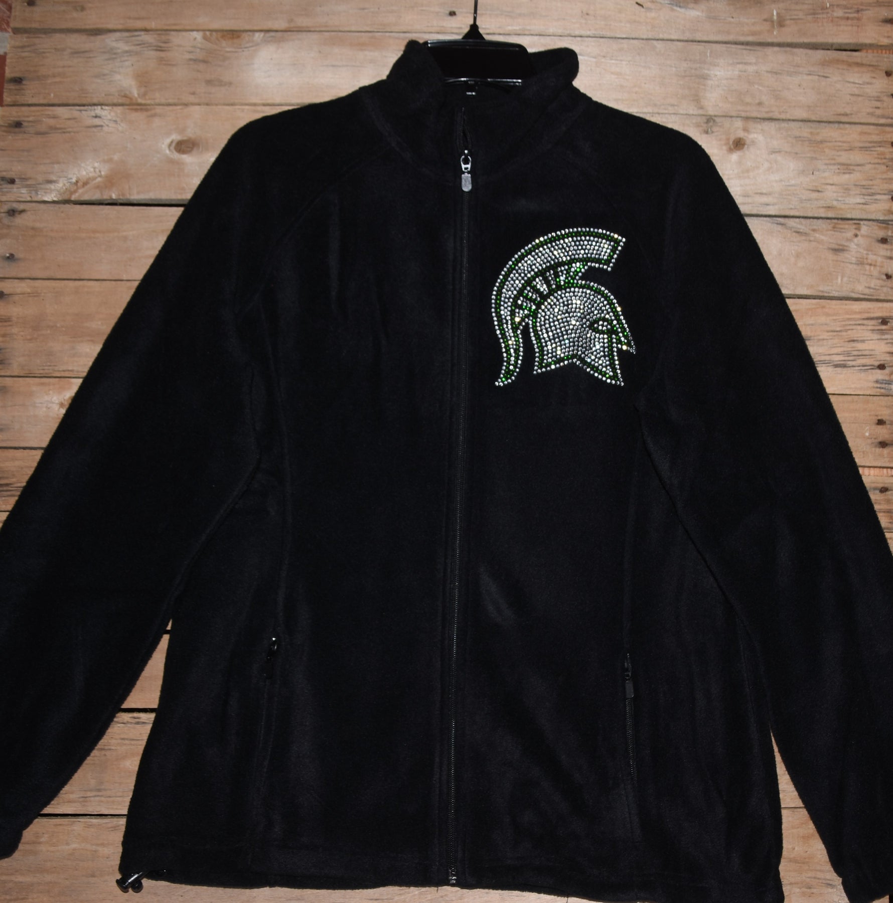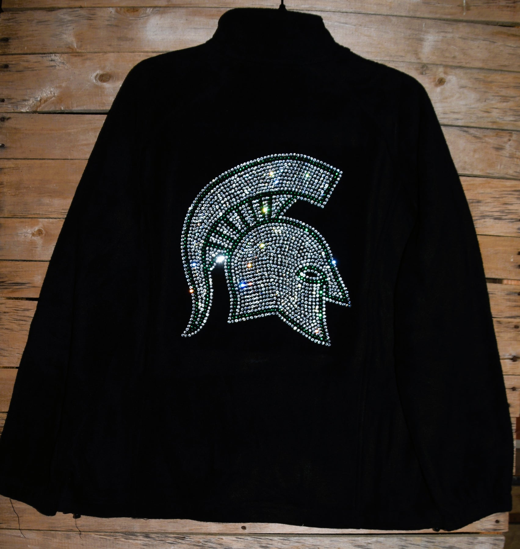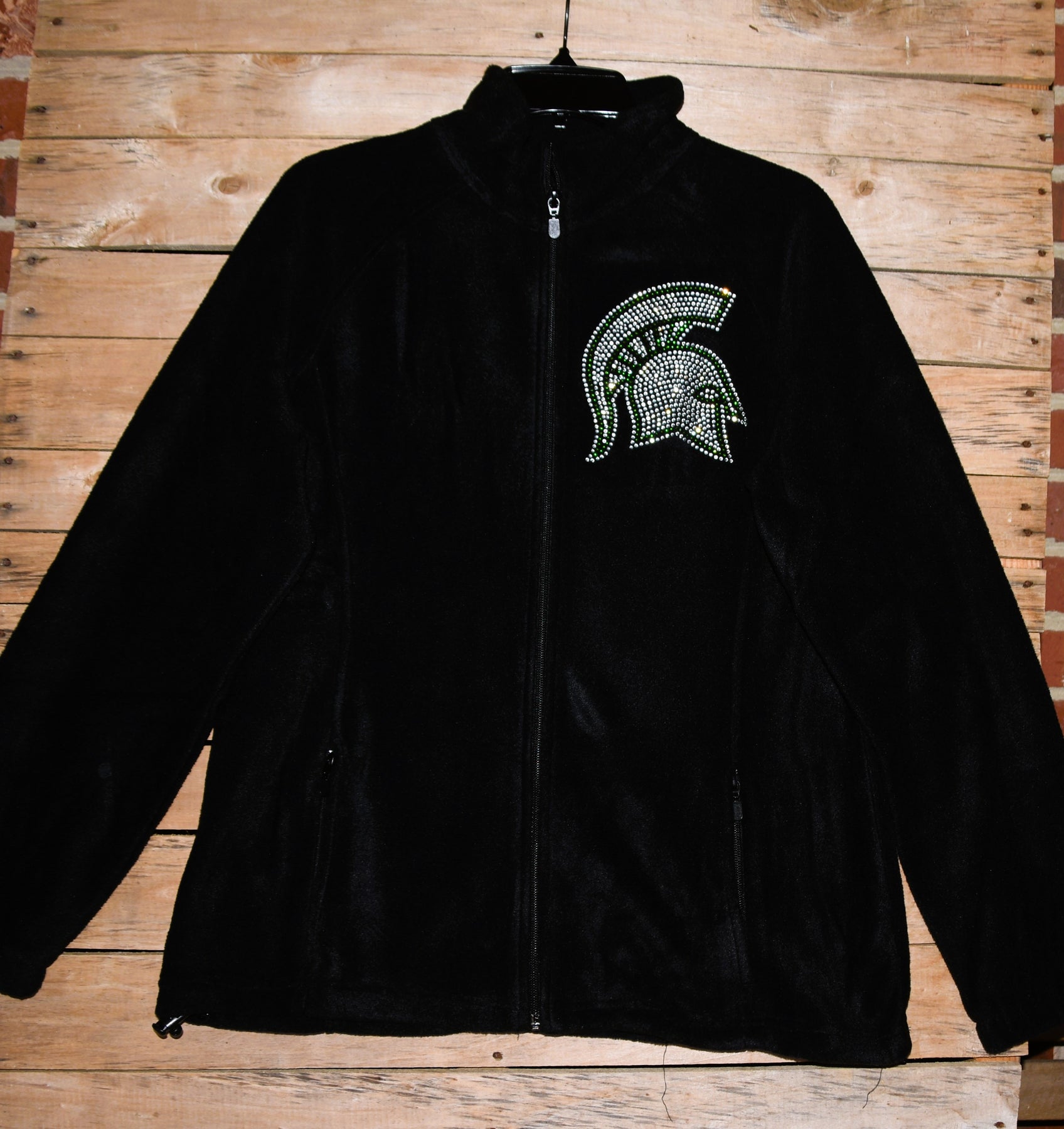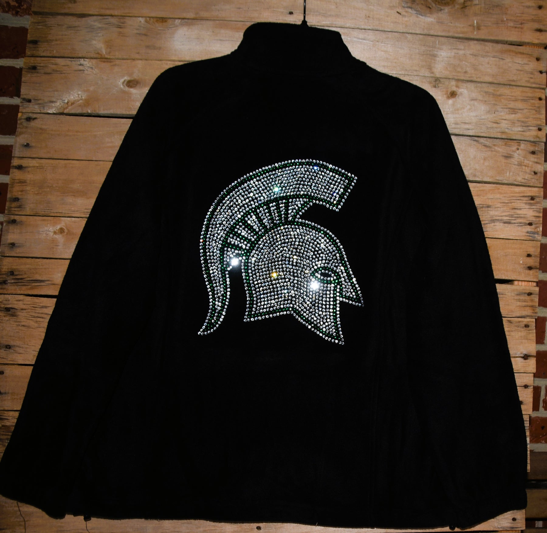 Cheer on the Michigan State Spartans in style in this officially licensed first quality rhinestone bling custom made to order fleece jacket.