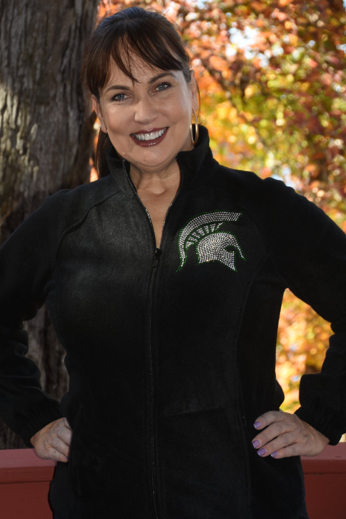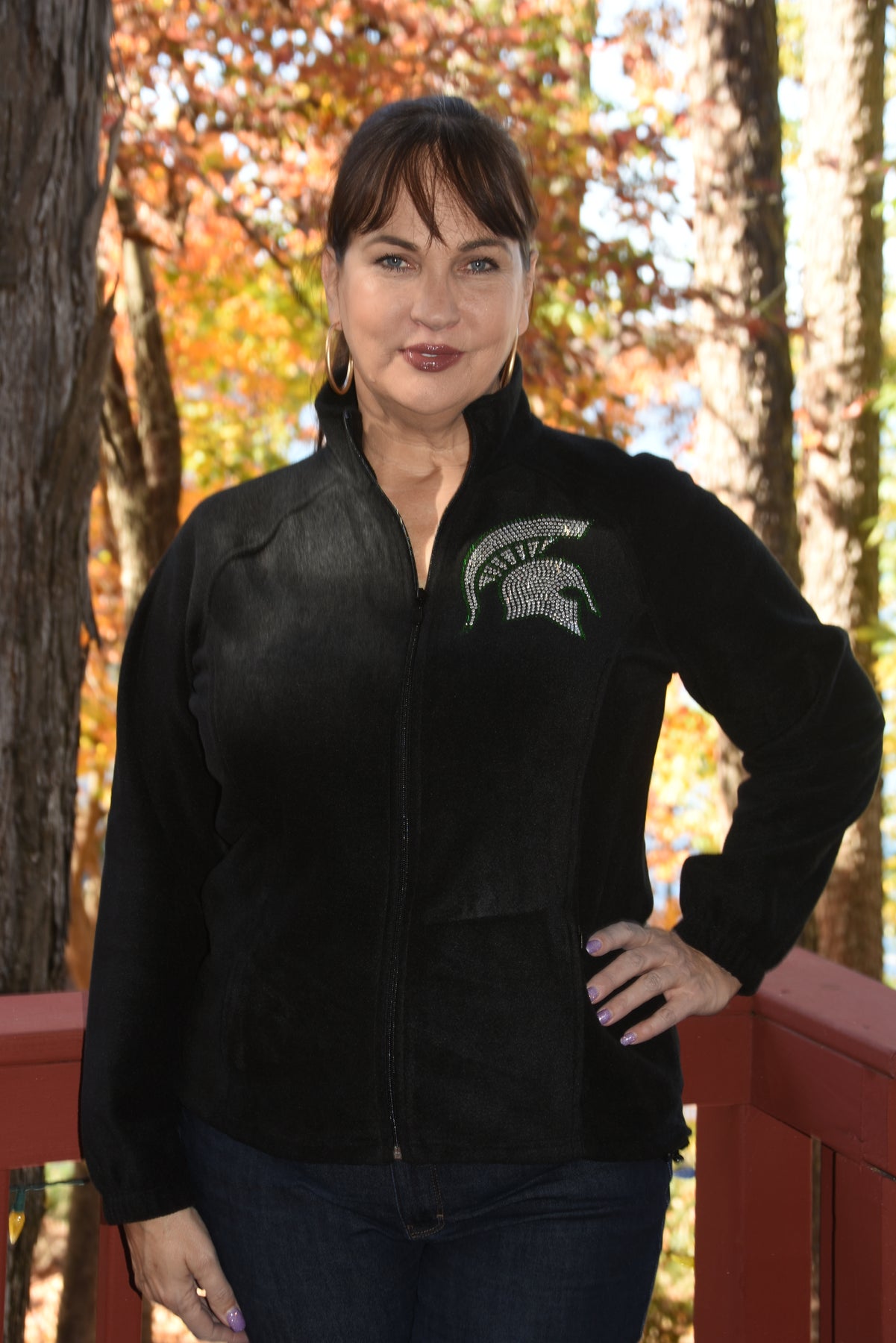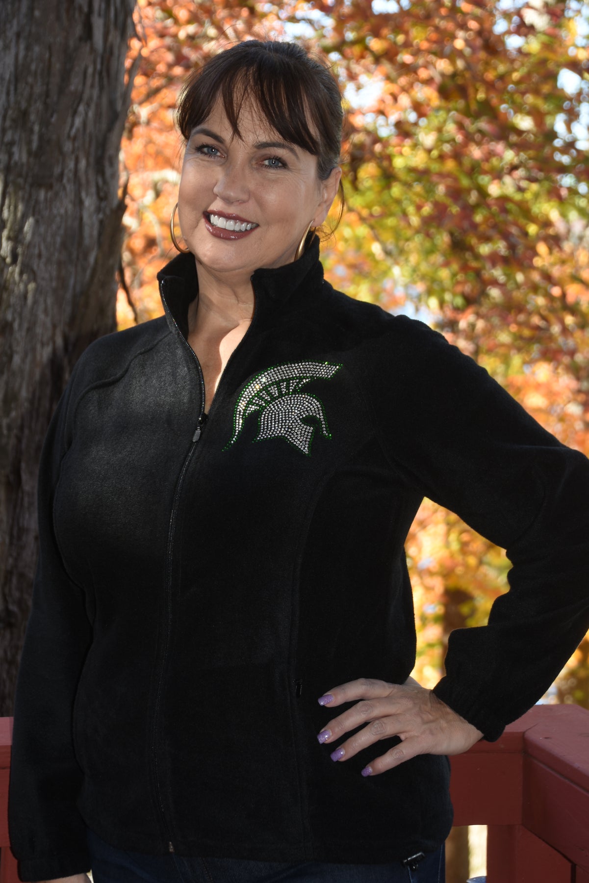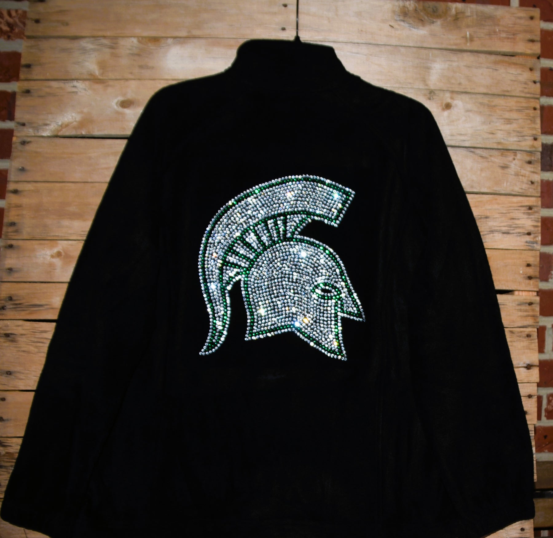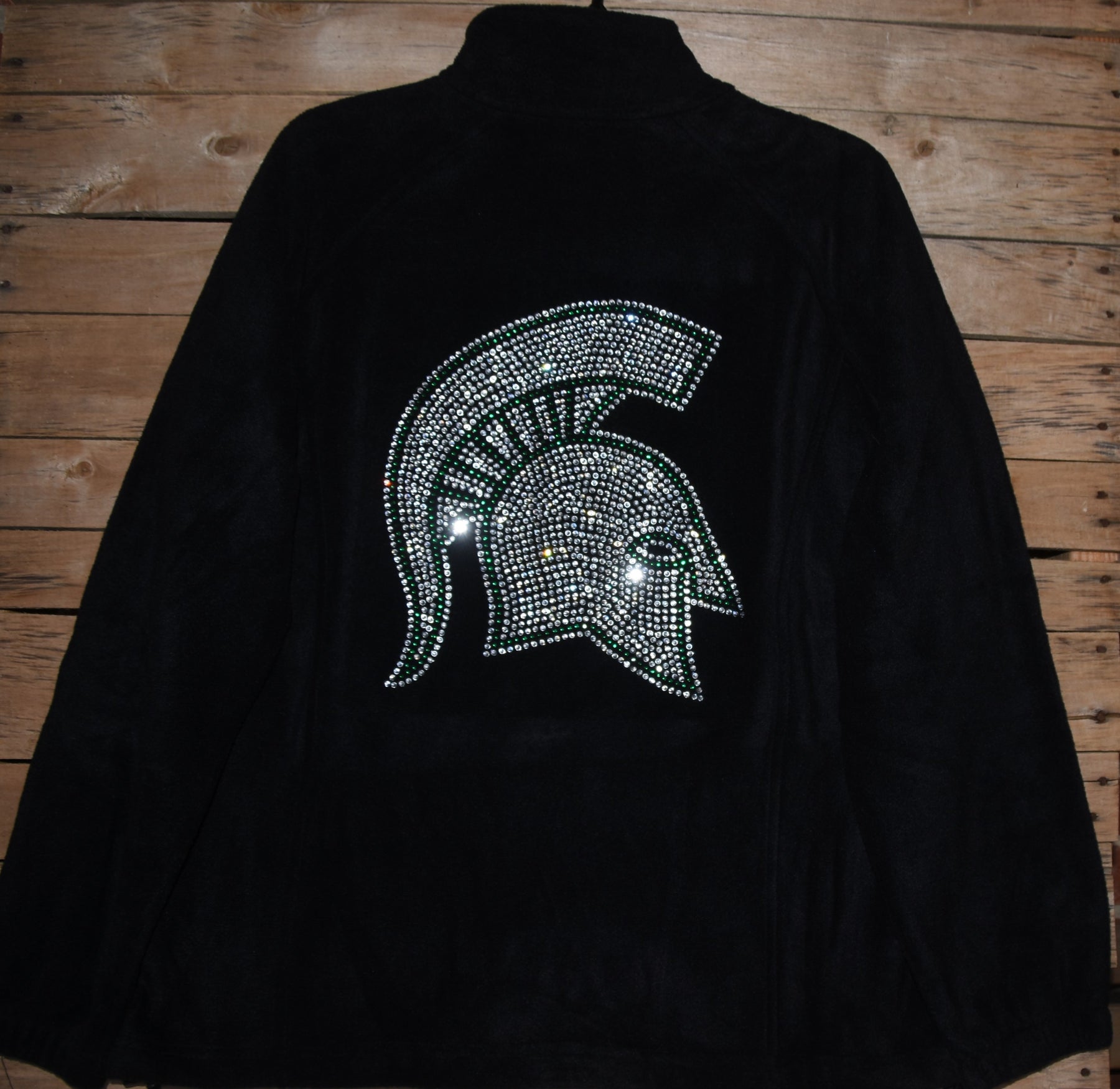 Cheer on the Michigan State Spartans in style in this officially licensed first quality rhinestone bling custom made to order fleece jacket.