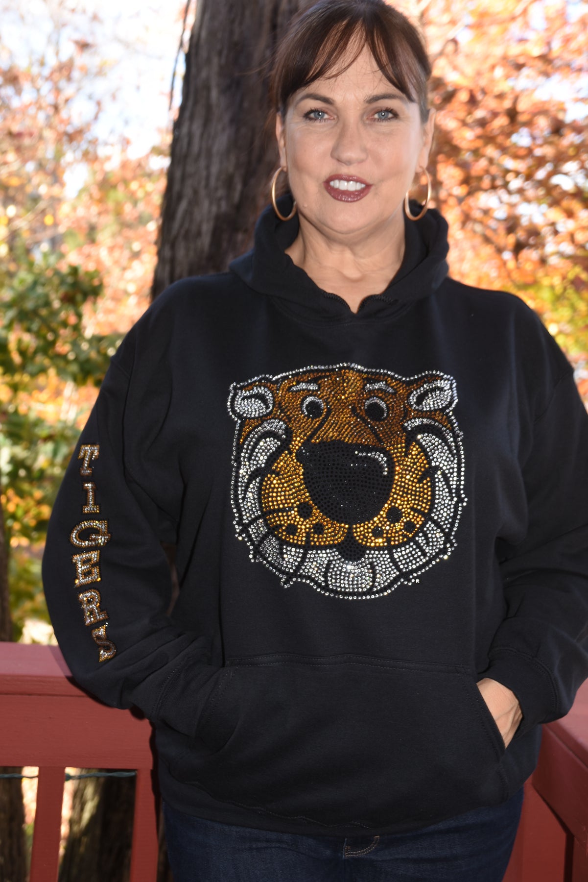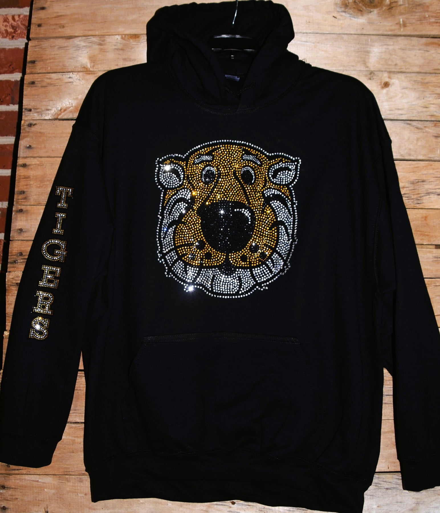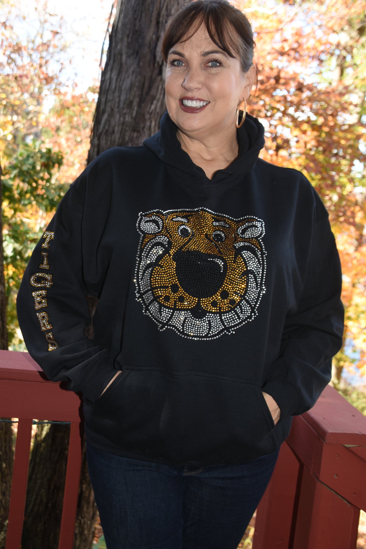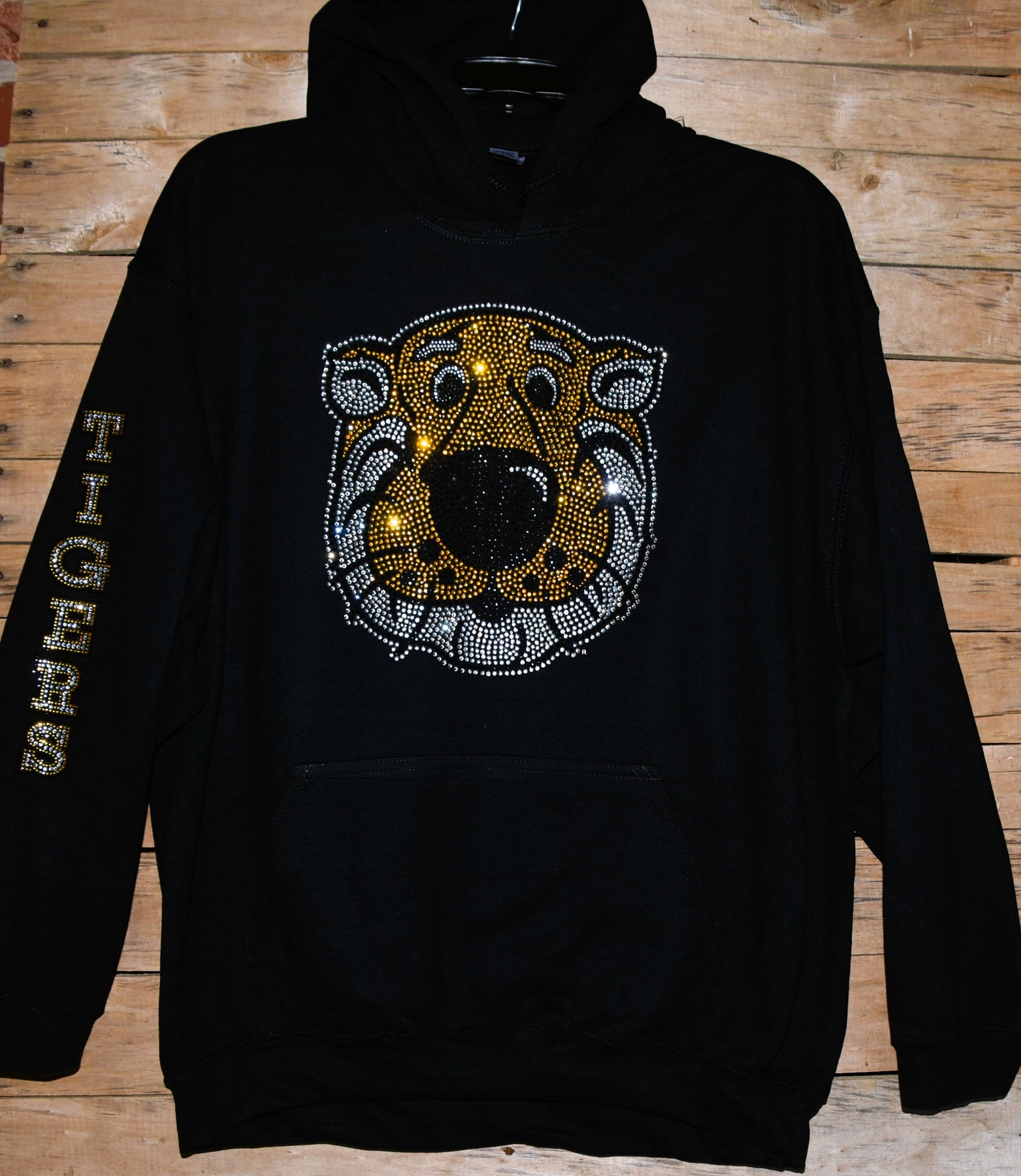 Missouri Tigers Mizzou rhinestone  bling sweatshirt or hoodie featuring a large Missouri Tiger on front and a rhinestone  Tigers on a sleeve.