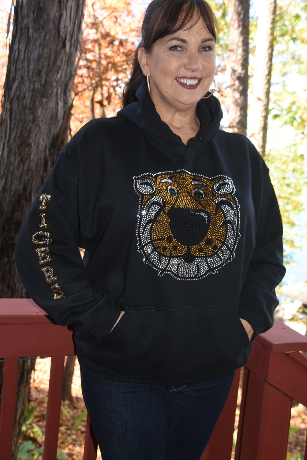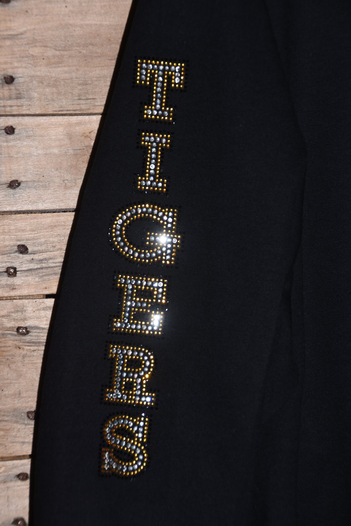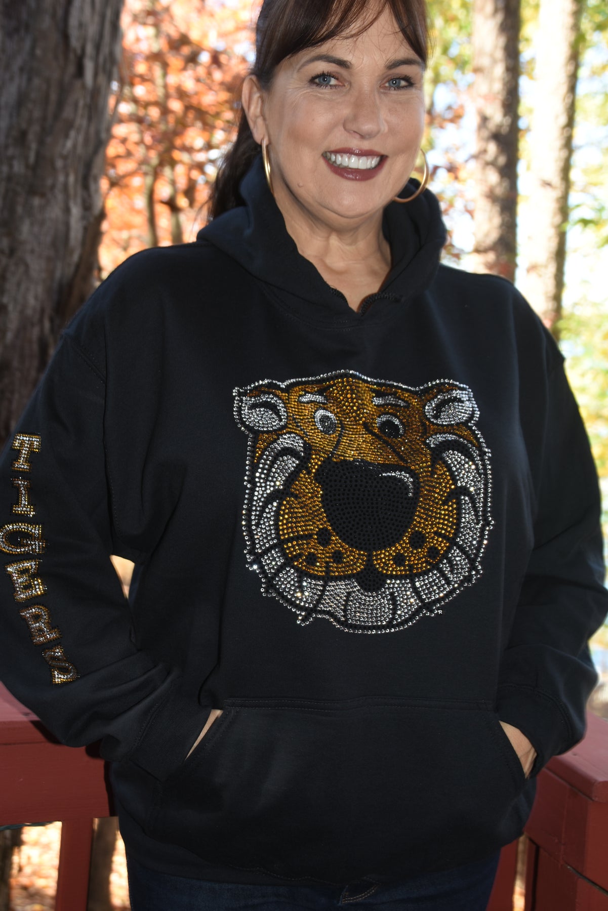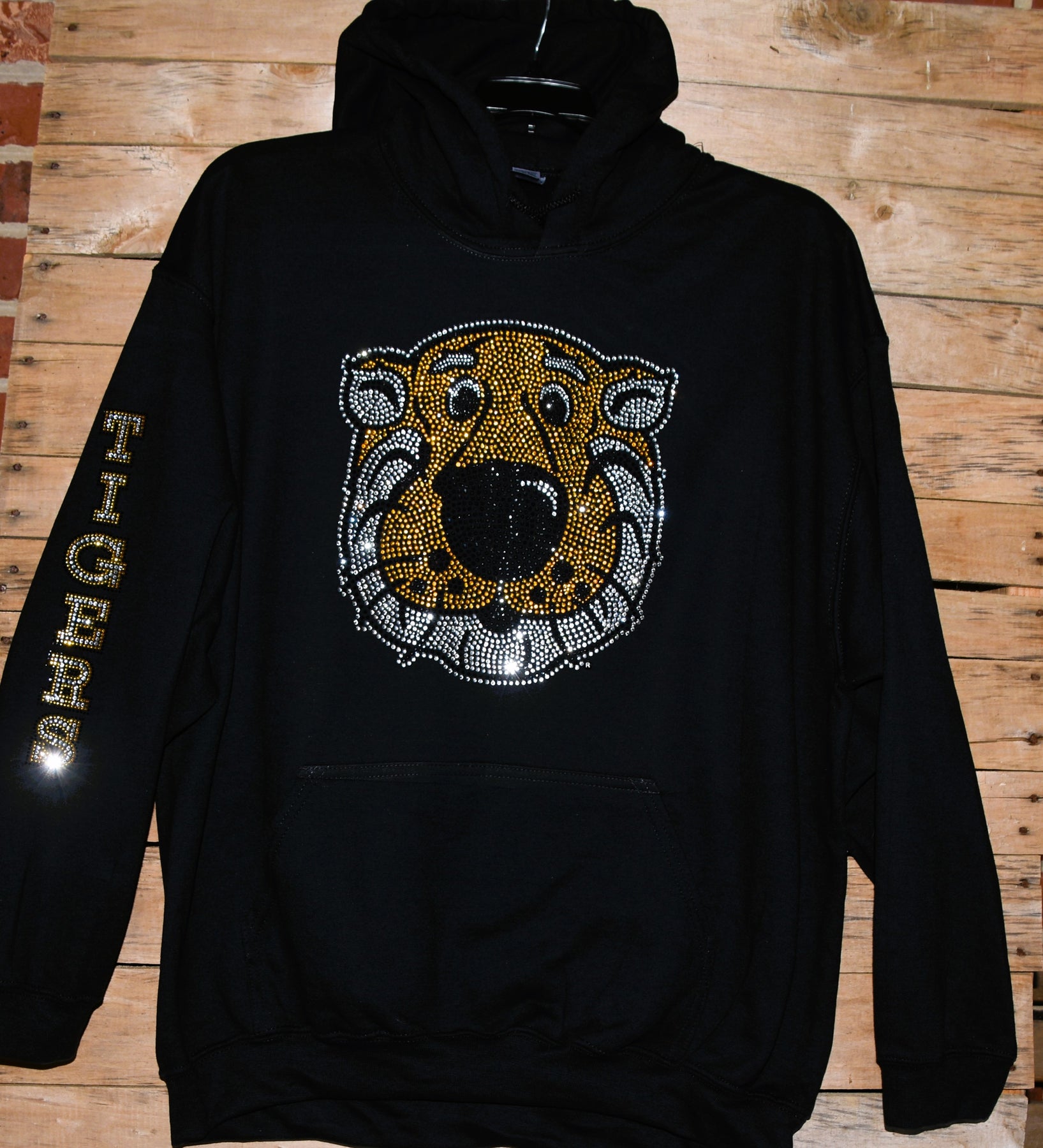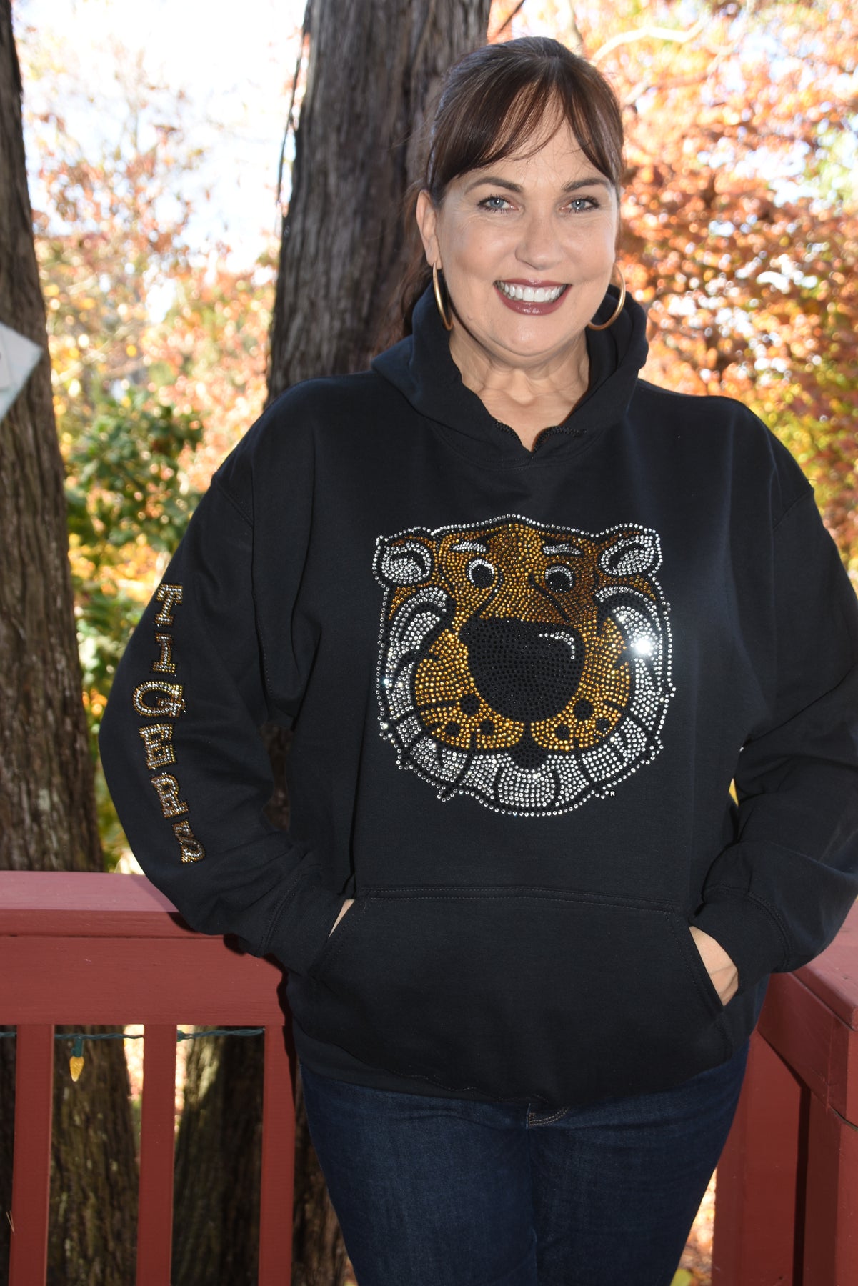 Missouri Tigers Mizzou rhinestone  bling sweatshirt or hoodie featuring a large Missouri Tiger on front and a rhinestone  Tigers on a sleeve.